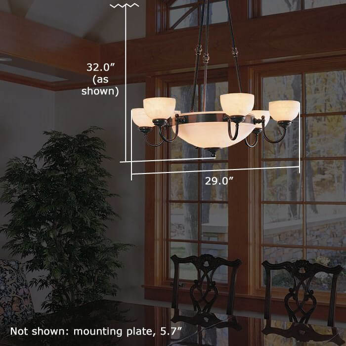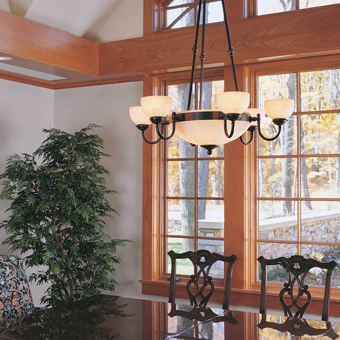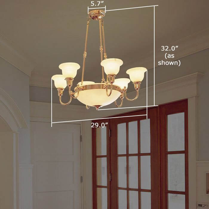 This six-arm alabaster chandelier is suitable for commercial interior and larger scale residential interior lighting. The homeowner of the traditional home shown chose our genuine alabaster Bell Cup shades and Smooth Multi-Rod Fittings for their foyer light. The classic style of this genuine alabaster chandelier makes it a popular lighting choice for rooms with high ceilings such as parlors, foyers, stairwells, and master bedrooms.