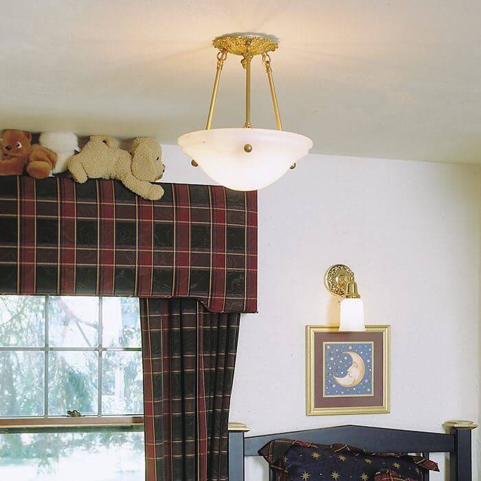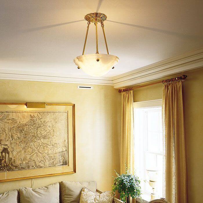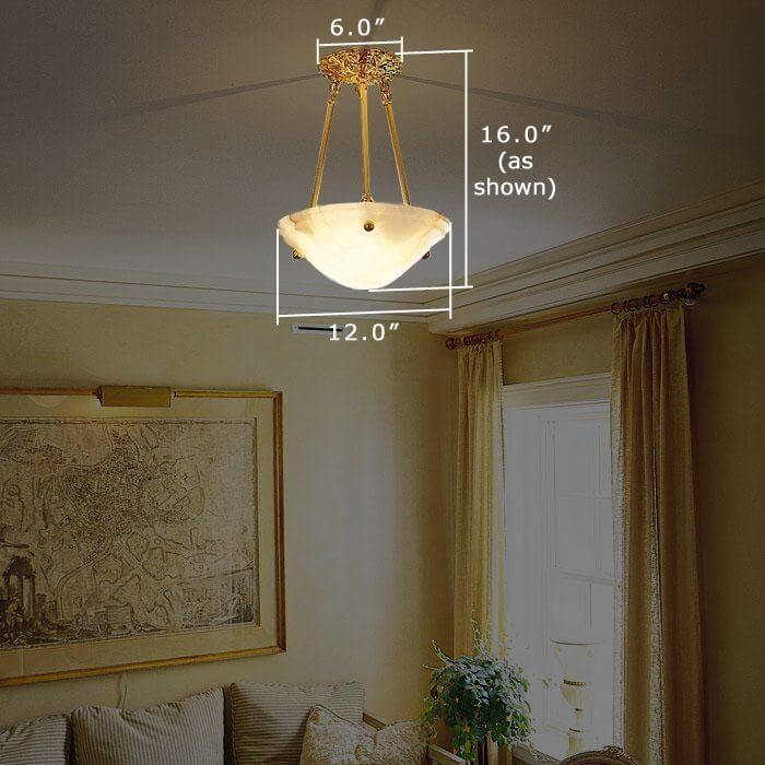 This elegant alabaster pendant light fixture provides soft ambient light for a warm and inviting den. Ornate classical details on this alabaster pendant light add to the refined character of the room. For any room, alabaster pendant lighting is a timeless choice that complements many styles.
