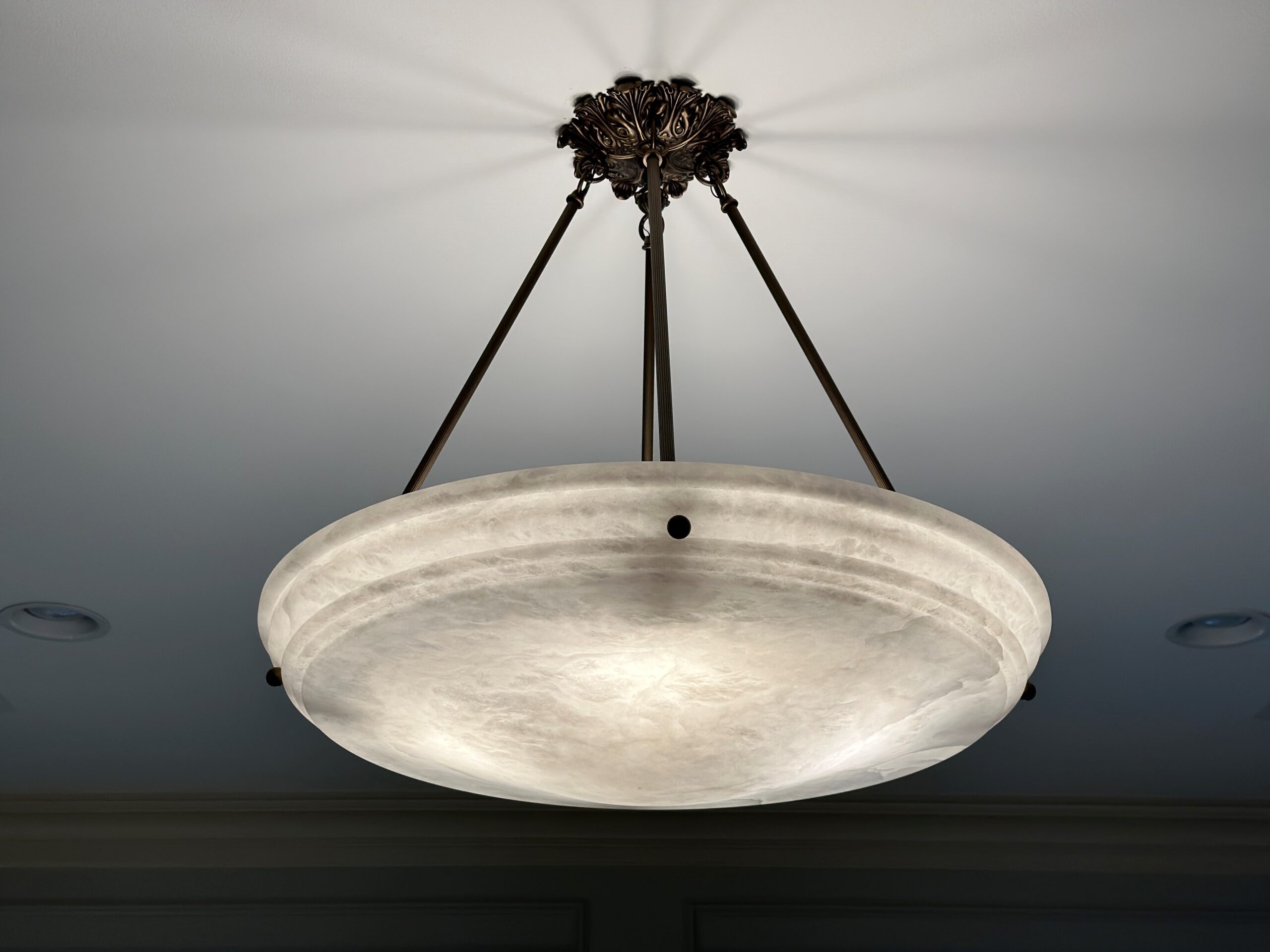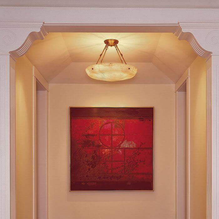 Framed by fluted corbels, the Hampton alabaster pendant light stands out as the centerpiece of this structured vignette. The concentric rings of the Hampton alabaster light speak to the carved ogee crown molding capping the doorway creating a harmonious combination. This alabaster light fixture is perfect for a period home with original architectural details and contemporary interior decor.