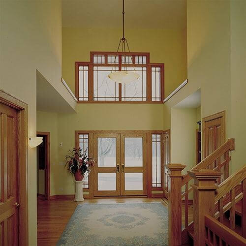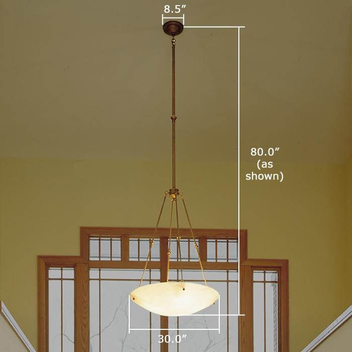 The spacious foyer of a contemporary constructed traditional home is lit by a 30 inch diameter Empire Alabaster Pendant light fixture. The architect specified an 80 inch Overall Length so the alabaster bowl is visible through the large transom window from outdoors. The Empire Alabaster Pendant, 30″ Diam Multi-Stem features the smooth elliptical profile of the Empire Alabaster Bowl Family of light fixtures. Because of its simplicity of shape, our customers have chosen this alabaster light for use with a wide range of architectural styles, from traditional Colonial and Art Nouveau to Postmodern. This alabaster pendant light emits a beautiful, pleasant glow and provides plenty of general lighting power.