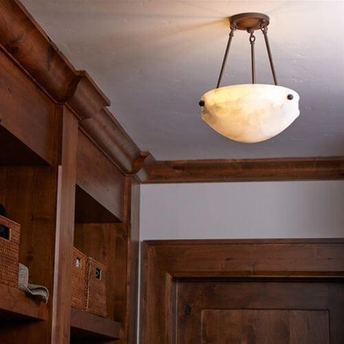 Carved from authentic natural alabaster stone, the Tuscany Pendant provides beautiful interior lighting for hallways, bedrooms, bathrooms, dens, and other smaller spaces. Shown here lighting a custom built master bedroom closet and dressing area, the petite scale and shorter Overall Length of the genuine alabaster pendant makes it a great fit in a modestly sized space. Natural veining in the real alabaster stone and solid brass fittings metal finished in warm Antique Copper mean this small fixture has a lot of character.