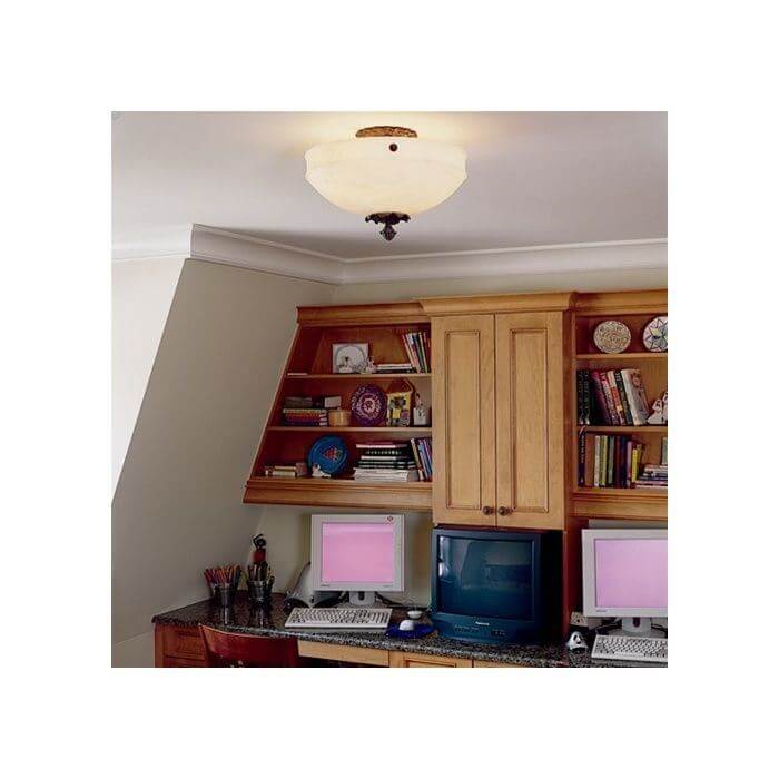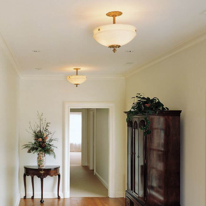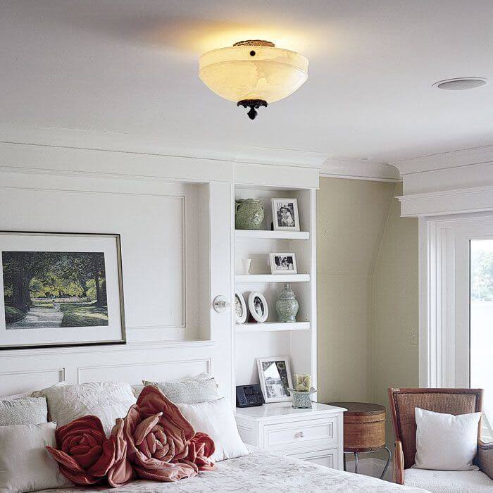 Low eight foot ceilings do not necessarily have to be a deterrent when choosing stylish lighting for a bedroom. As shown here, a single stem alabaster pendant with a short overall length keeps the fixture tight to the ceiling in this upstairs bedroom. The shallow overall length, combined with the curved cavetto crown molding, create the illusion of a taller ceiling. The design of this upstairs bedroom also carefully navigates the issue of a steeply pitched roof producing an angled wall. This obstacle is overcome in the design with a built-in that not only offers valuable storage space, but also functions as a headboard.
