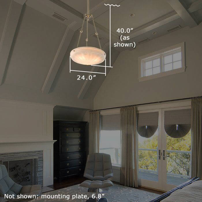 A welcome addition amongst the cool neutral color pallet of this airy bedroom, the Palladian alabaster pendant light fixture enriches the tranquil setting with soft light and a feeling of warmth. To take advantage of the soaring ceilings, these alabaster pendants were modified with single rod extensions to reduce bulky hardware and streamline the design. Ask about this modification for tall ceilings when ordering.