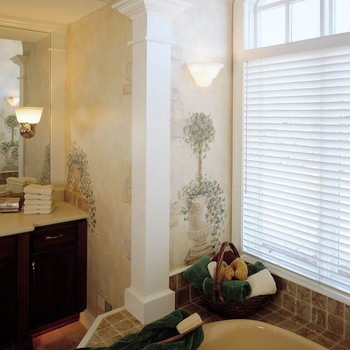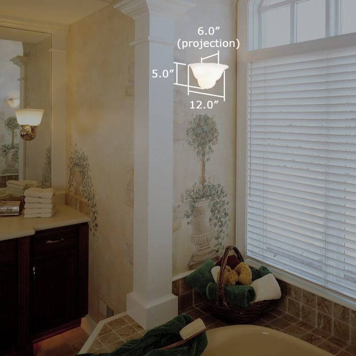 Our genuine stone Raphael 12 inch Wide Alabaster Wall Sconce provides soft illumination to the bathtub area of a recently decorated Tuscan Style master bathroom. Complementing the faux finished walls, square painted wood columns, and tiled tub surround, the real alabaster sconces are an appropriate choice for the European Style bath. Shown in the background, mounted directly to the mirror and furnishing brighter illumination to the vanity area, is our made to order Shoreland One Light Straight Arm Sconce with 2-1/4 shade holder and A161 Opal Satine English Bell Shade.