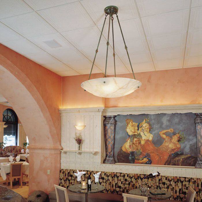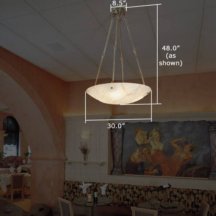 “Blessed are the ones whom the Muses love; sweet is the sound that flows from their lips.“ ~ From Homeric Hymn to the Muses and Apollo Capture the romance and history of ancient Greece with this spectacular authentic alabaster pendant light reproduced from a 1903 antique light fixture. The muses symbolize inspiration for music, poetry, fine arts, and sciences. On the remarkable hand-carved alabaster stone bowl of this outstanding interior light fixture, each individual Muse is pictured in a flowing robe carrying the adornment appropriate to her art. The restaurant shown specializes in Northern Italian cuisine and several carved Pierian Muses Alabaster Pendants provide enchanting allure and soft illumination for diners. The interior of the dining room has 12 foot ceilings and we made the Overall Length of the fixtures 48 inches to keep them at height well above visitors’ heads, but low enough for the details to be appreciated by diners.