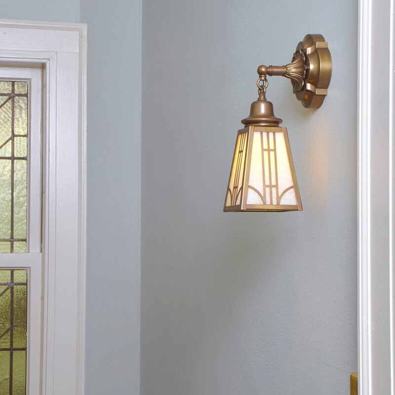 The handcrafted Cambridge™ One Light Chain Link Lantern Sconce with 2-1/4 inch Shade Holder was custom designed for a client who needed authentic Arts & Crafts Style lighting with extraordinary details for their meticulously restored East Coast period home. A heavy cast Barbed Quatrefoil backplate serves as the base for the sculptural floral center plate of the light fixture. A chain link connection holds a round period inspired shade holder. Shown in our Distressed Brass finish, the long tapered lantern shade is embellished with a decorative overlay and features our new Honey Ripple Opaline art glass panels. Tailor your lighting to fit your unique décor with our made in Milwaukee fixtures.