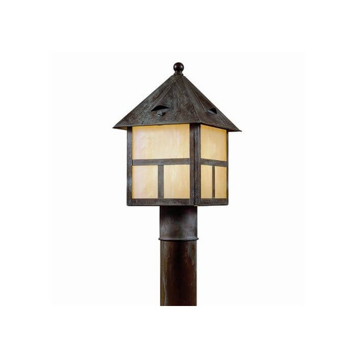 Shown above is our handcrafted Cottage Lantern 8 inch Wide Exterior Post Light Line Voltage in authentic Verdigris Patina with warm Iridescent Gold White glass panels and crisp T-Bar Overlay. The design of our handcrafted Cottage Lantern 8 inch Wide Exterior Post Mount Light is inspired by Shingle Style homes on the East Coast, but over the years, customers have also ordered the Cottage Lantern for English Tudor and American Foursquare architecture as well as beach homes, log cabins, and conch houses. The made in Milwaukee Cottage Lantern features hand bent roof vents and your choice of decorative Overlay including Windowpane or T-Bar as shown above. Use this high quality post mounted light in your garden room, along walkways and paths, to mark your driveway entrance, or anywhere your landscape needs attractive lighting. Order your post at the same time as your lantern to ensure they are metal finished together. If you need help determining the best length for the made to order brass post, please contact our sales team for helpful advice.