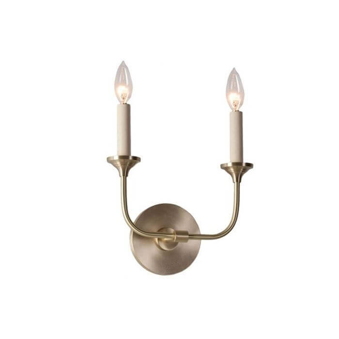 Our handcrafted Celeste Two Light Curved Arm Sconce with electric candles is a streamlined modern wall sconce ideal for powder rooms, master bedrooms, living rooms, dining rooms, and breakfast nooks. The round solid brass cast mounting plate and gracefully curved arms support smooth bobeches a slim electric candles. Beautiful in Contemporary, Modern, Transitional, and Art Deco Style interiors, the Celeste Two Light Curved Arm Sconce with electric candle is available in 16 different high quality metal finishes. For assistance choosing the best metal finish for your wall sconce, please contact our sales team for expert lighting design advice.