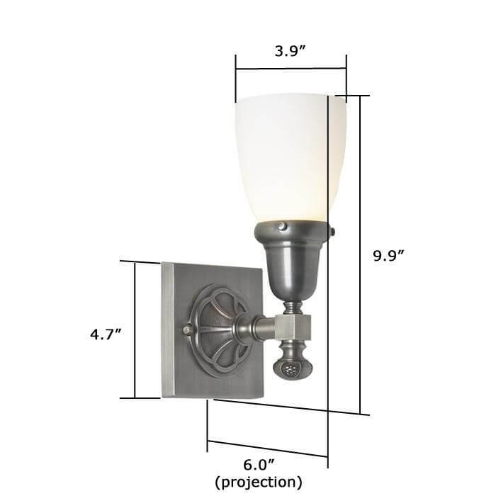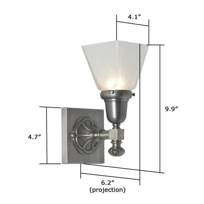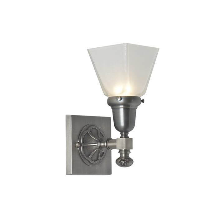 Inspired by William Morris, a founder of the English Arts & Crafts movement; our Morris One Light Straight Arm Sconce with 2-1/4″ shade holder works well in traditional and contemporary rustic interiors. Clean, durable castings evoke one of the hallmarks of the movement: simplicity of organic form without superfluous decoration. The heavy cast mounting plate on the sconce features a robust delineated floral motif which is in attune with the natural form of the textured cast finials. Elegant yet substantial, the Morris Wall Sconce is a popular light for master bathrooms, powder rooms, hallways, dining rooms, family rooms, foyers, and stairwells. Shown in classic Antique Nickel metal finish with an A101 Sandblast Frost Square Glass Shade, the Morris One Light Sconce can be tailored to suit your interior by choosing from our 13 high quality metal finish options. For assistance choosing the best metal finish for your wall light; please contact our sales team for helpful lighting design ideas and tips.