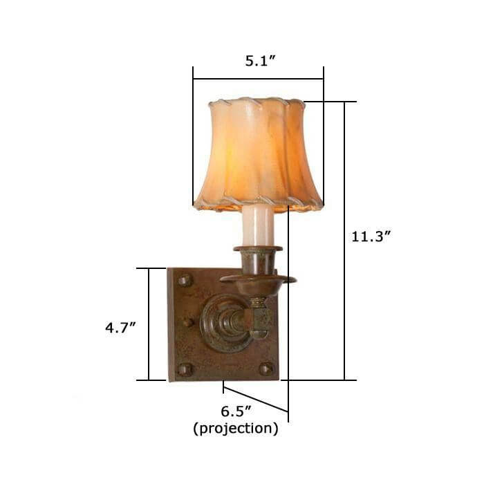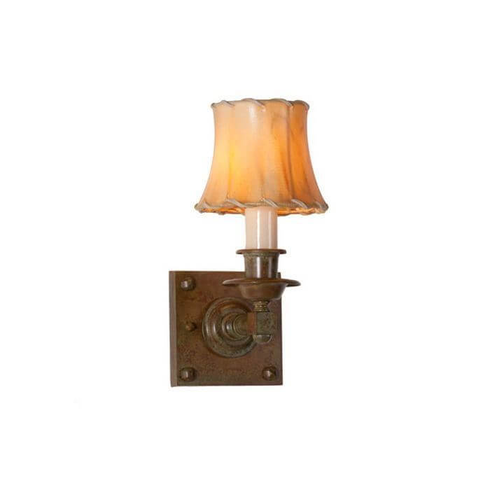 The Durham Rustic One Light Candle Sconce features rustic embellishments including hand formed decorative rivets and a handmade sheepskin shade. Formerly known as Durham Rustic One Light Sconce with Electric Candle