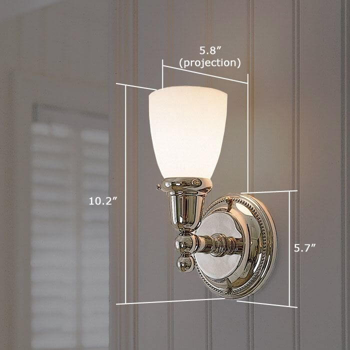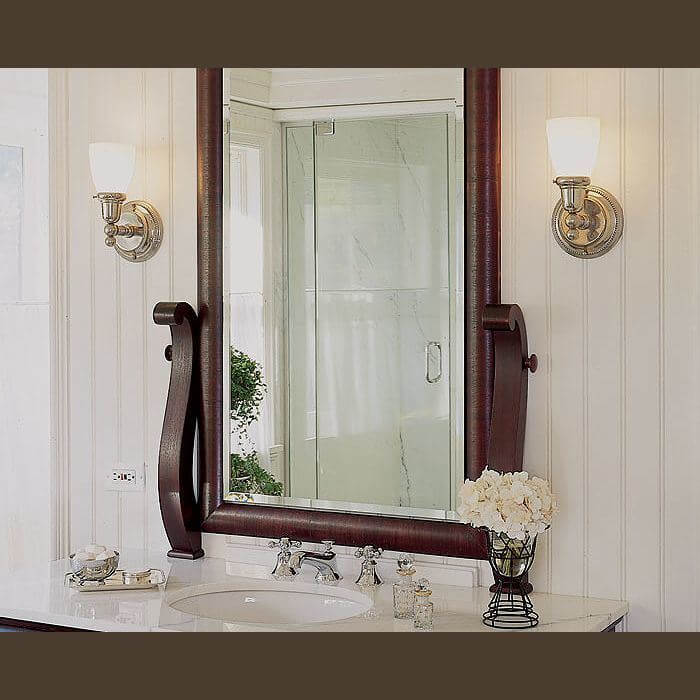 Our Carlton One Light Wall Sconce captures timeless elegance and fits in a variety of interiors. Shown in gleaming Polished Nickel, this handsome light fixture adds cachet to a crisp beadboard wall in the guest bathroom of a lakeside cottage.