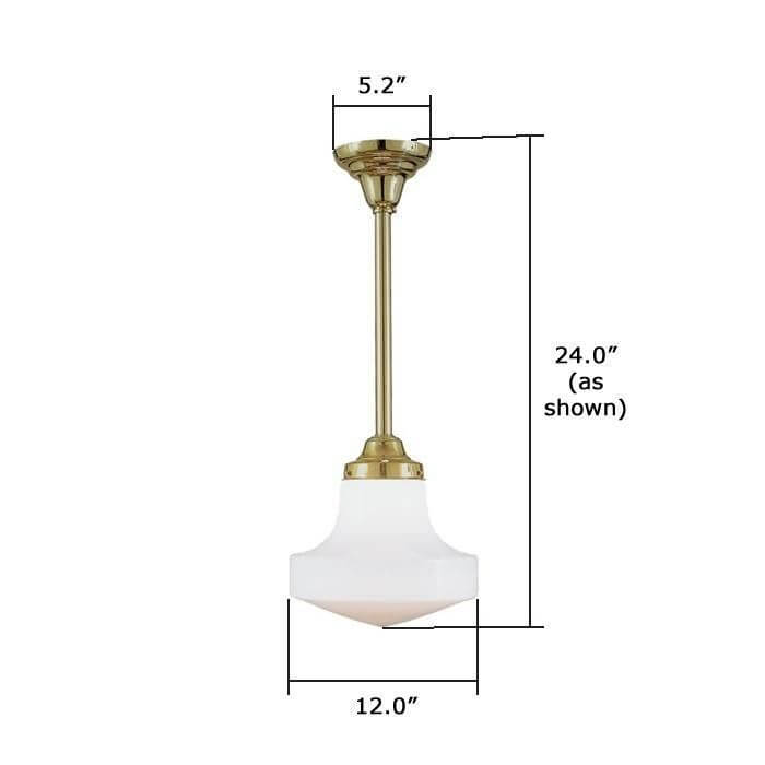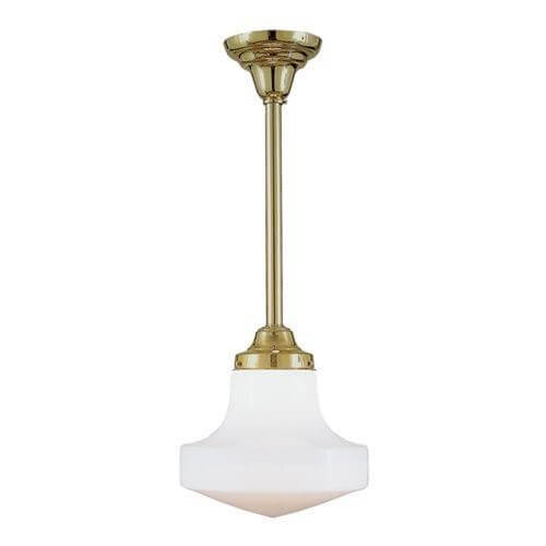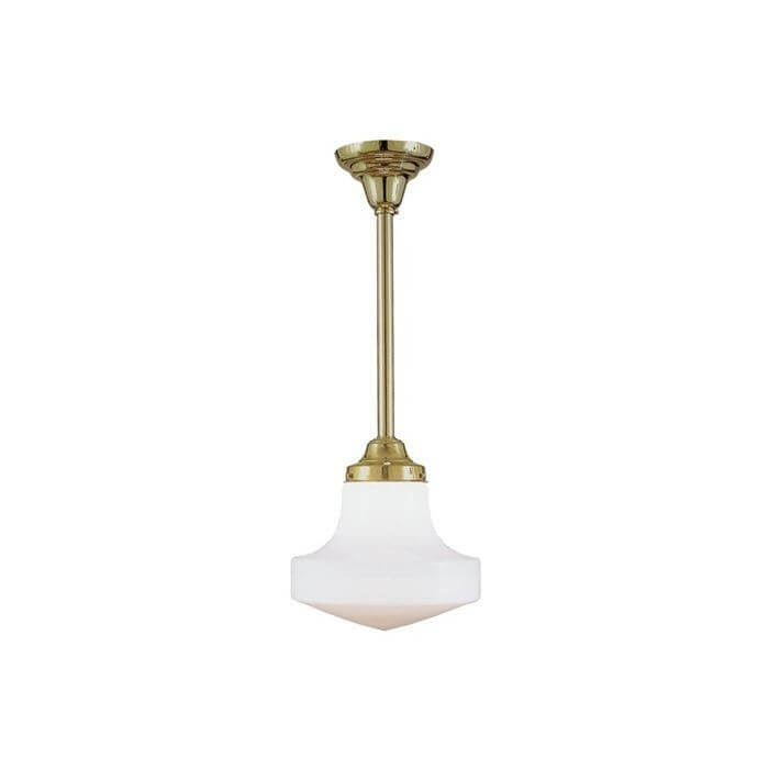 The Shoreland One Light Pendant with 4-1/4 inch shade holder is the paradigm of clean, simple design. Based on a 1905 original antique ceiling light, our handcrafted made in Milwaukee pendant can be ordered in any Overall Length based on your ceiling height. Shown in bright Polished Brass metal finish with a clean C308 Barcelona Shade. Use this light fixture over kitchen islands and counters, in home bars and pubs, in recreation rooms, laundry rooms, mud rooms, bathrooms, and hallways. Our most popular pendant due to affordability, quality, and style, the Shoreland One Light Pendant can be tailored to suit your room by choosing from our 13 high quality metal finishes and array of shade options. For assistance choosing the best metal finish, Overall Length, and shade for your ceiling pendant; please contact our sales team for helpful lighting design ideas and tips.