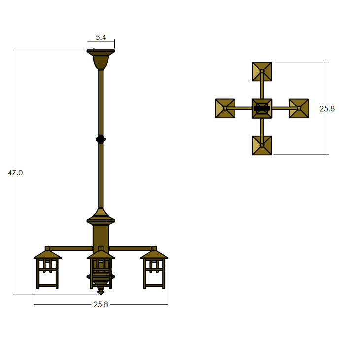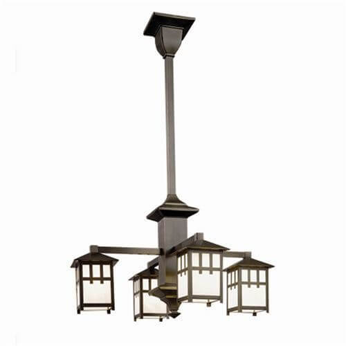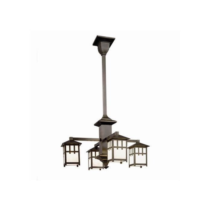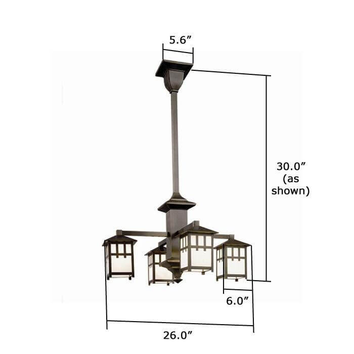 Our handcrafted Craftsman Four Light Columnar Chandelier offers rustic elegance in period inspired lighting. From cottage and cabin to mountain home and lodge, our made in Milwaukee Craftsman Lantern Four Light Chandeliers have been a favorite lighting choice of Arts & Crafts lovers for more than thirty years. The beautifully proportioned lantern chandelier features a robust columnar central body culminating in a square beveled finial. This light fixture works well for Bungalow, Arts & Crafts, Shingle Style, Mission, Adirondack Style and Craftsman homes in kitchens, dining rooms, living rooms, family rooms, studies, libraries, dens, and large foyers and entryways. The chandelier is made to order to the best Overall Length based on your ceiling height. Tailor the lantern chandelier to suit your interior by choosing from a wide selection of high quality metal finish choices and art glass panel colors. Contact our sales team if you need expert assistance designing your interior lighting.