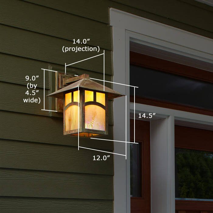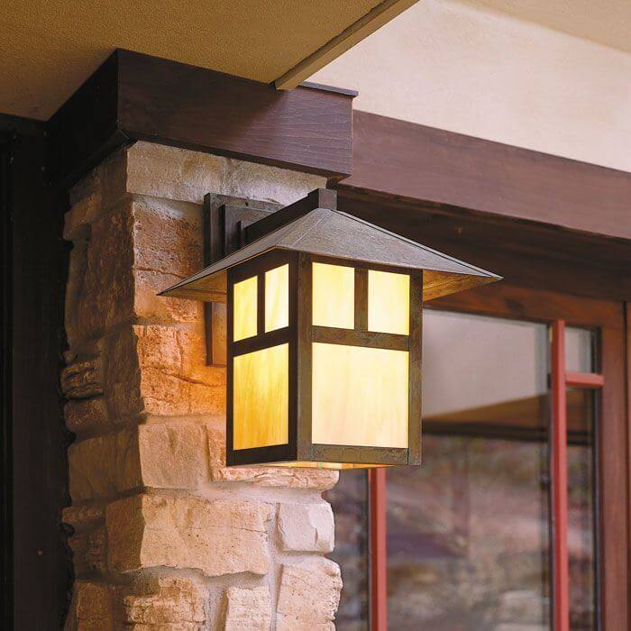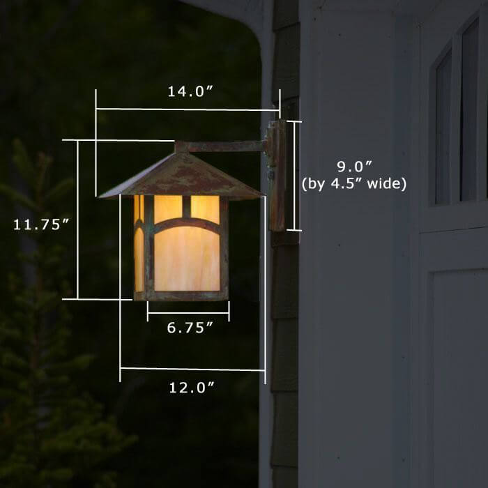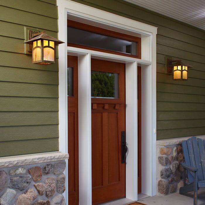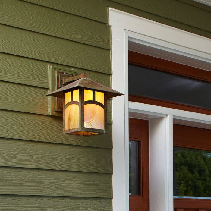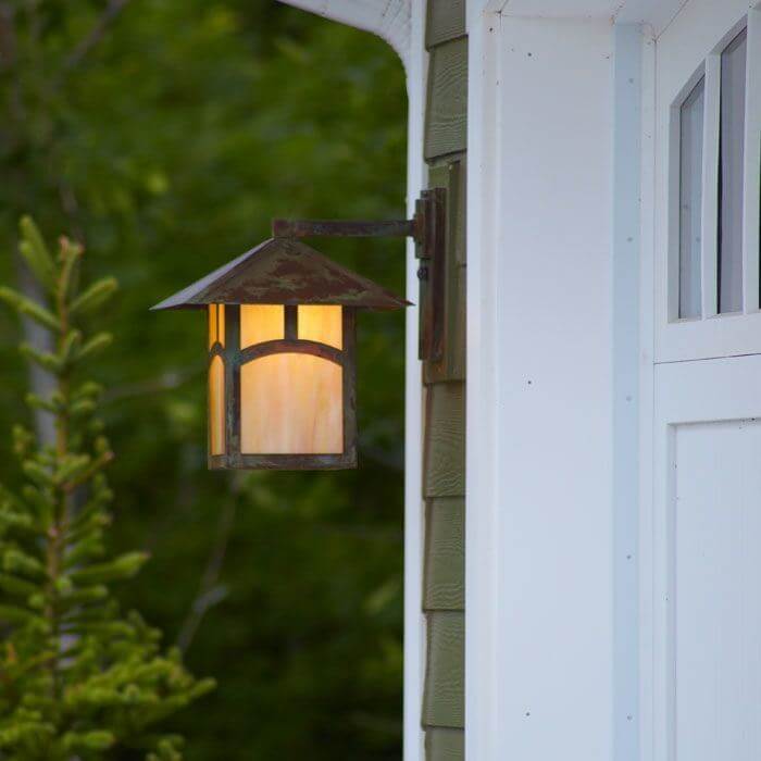 The charming garage of a classic American cottage features natural cedar siding and arch shaped windows on the restored garage doors. Our wall mounted exterior light fixture Pine Lake™ Lantern 12″ Wide Straight Arm Exterior Wall Light provides ample and attractive illumination on either side of the garage doors. Mounted to a wood plate over the siding, the outdoor lanterns project from the garage wall and are visible from the front and side of the garage. The Pine Lake Lantern pictured has a 12 inch roof width and Straight Arm Wall Mount. Genuine Verdigris Patina finish paired with Gold White Art Glass Panels is a warm, rich combination that works well in the forested setting of this residence. The Arch Overlay option is the perfect complement to the arched windows in the vintage garage doors. Although this prairie style outdoor lantern is perfectly suited to this traditional garage, its clean lines work also work well on the porches and garages of American Foursquare homes, Japanese inspired architecture, and sleek modern contemporary homes.