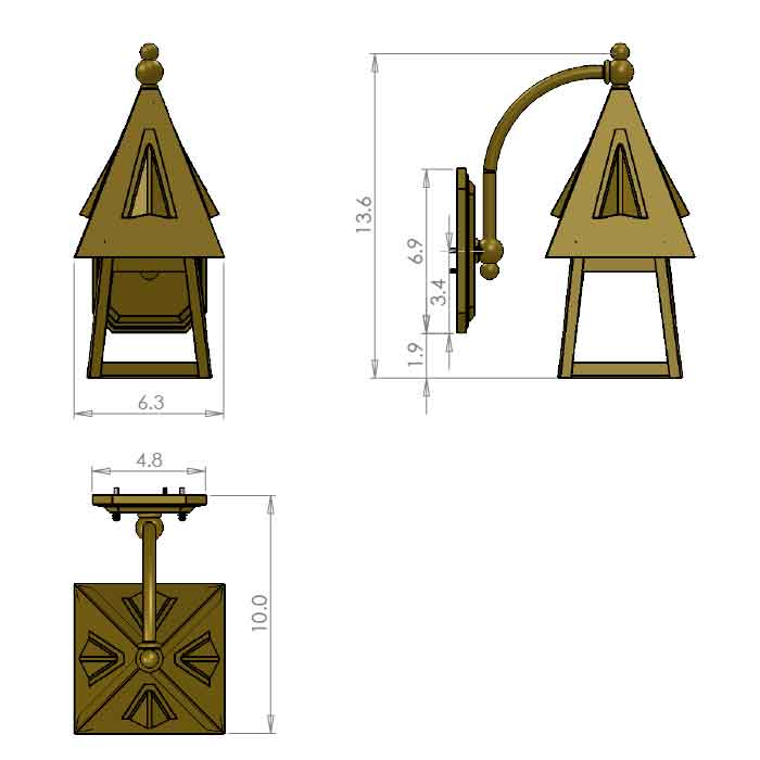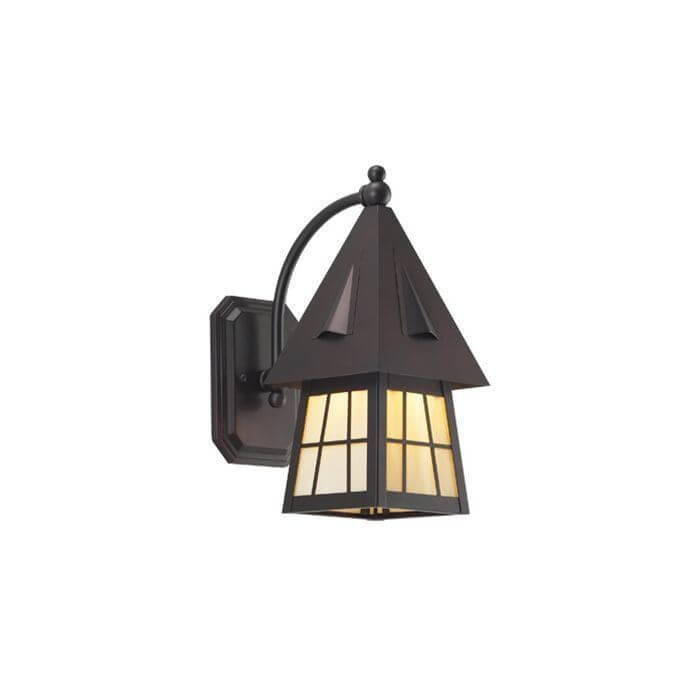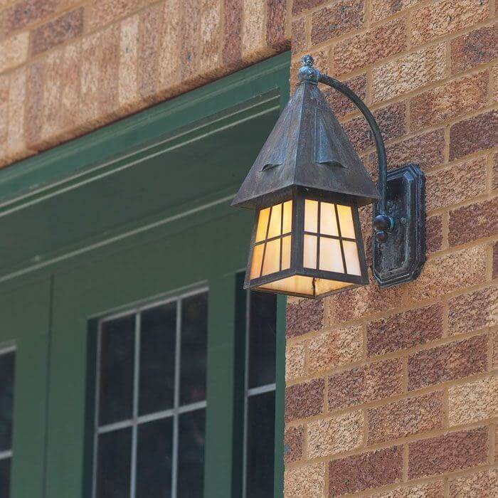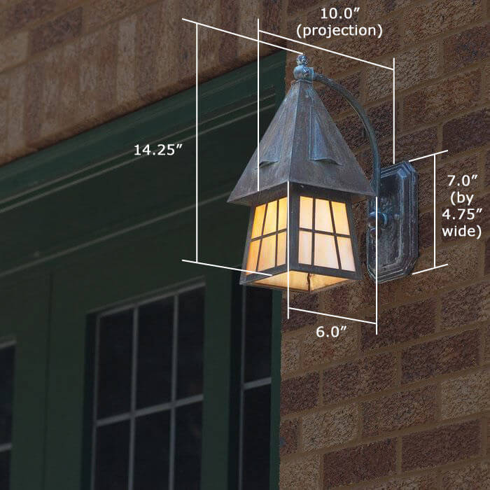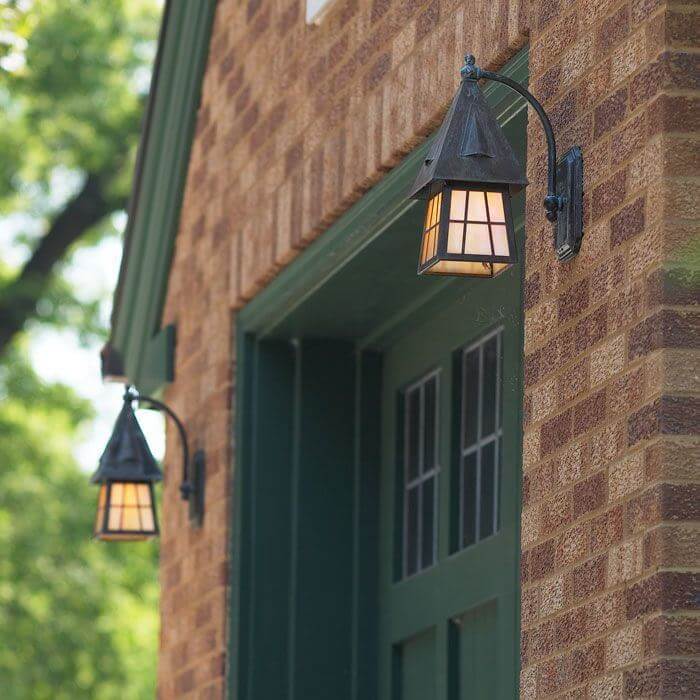 Over the years, customers have described our beloved European Country Lantern as charming, romantic, and alluring. Inspired by the English Arts & Crafts movement that began in 1880 and flourished through the 1920‘s, this enchanting outdoor lantern has an air of medieval charisma making it the ideal outdoor light for country homes, summer getaways, lake cottages, Tudor Revival homes, and fine estates. The 6 inch Wide Curved Arm Exterior Wall Light is the smallest size of the European Country Lantern outdoor sconces. The smaller scale is good fit for smaller porches and side door entryways, for flanking garage doors, porte cocheres, for out building such as gazebos and coach houses, and to be mounted to wooden posts. Shown above in rich Architectural Bronze metal finish with warm Gold White Iridescent art glass panels, the European Country Lantern with Curved Arm Wall Mount is proudly made in Milwaukee and designed to last for generations.