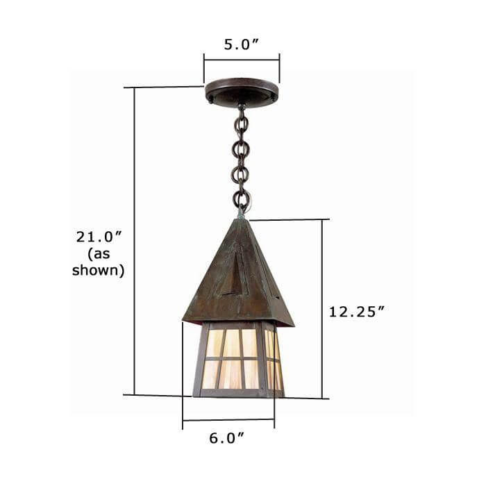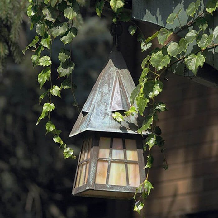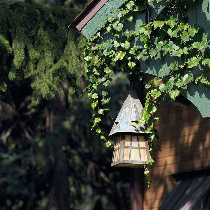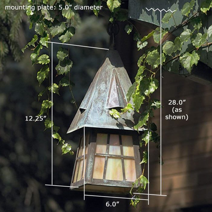 Over the years, customers have described our beloved European Country Lantern as charming, romantic, and alluring. Inspired by the English Arts & Crafts movement that began in 1880 and flourished through the 1920‘s, this enchanting outdoor lantern has an air of medieval charisma making it the ideal outdoor light for country homes, summer getaways, lake cottages, Tudor Revival homes, and fine estates. The 6 inch Wide Chain Hung Exterior Wall Light is the smallest size of the European Country Lantern outdoor lights. The smaller scale is good fit for smaller porches, covered balconies, and side door entryways; for flanking garage doors; for porte cocheres; for out building such as gazebos, pool houses, boat houses, and coach houses. Shown above in rich Architectural Bronze metal finish with warm Gold White Iridescent art glass panels, the European Country Lantern with Curved Arm Wall Mount is proudly made in Milwaukee and built to last for generations.