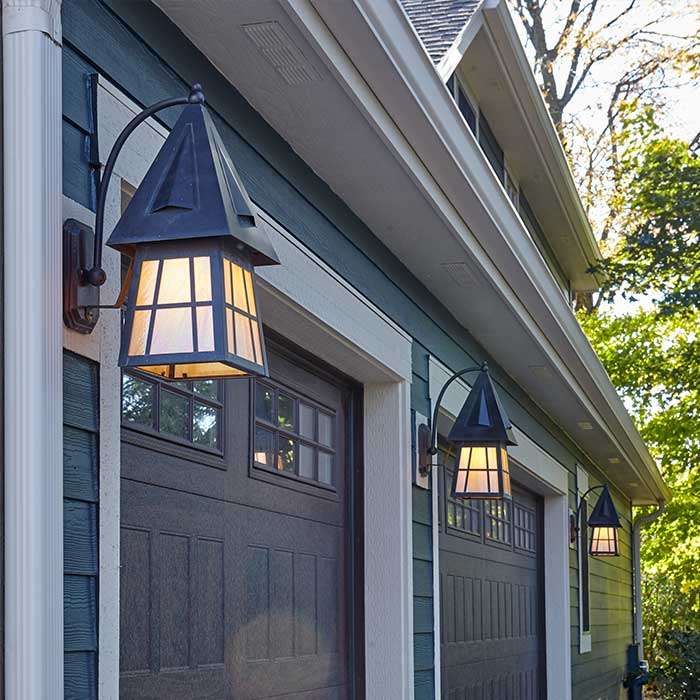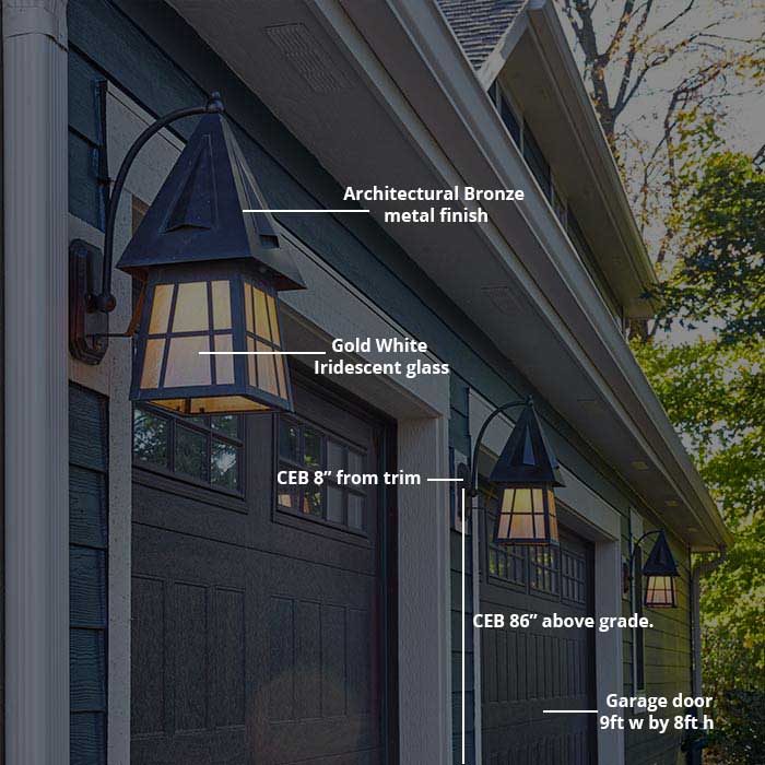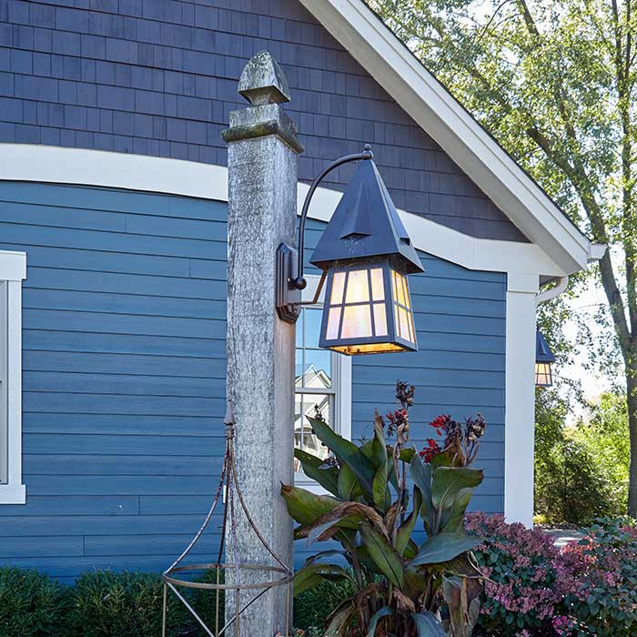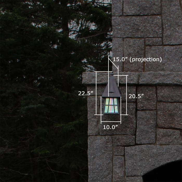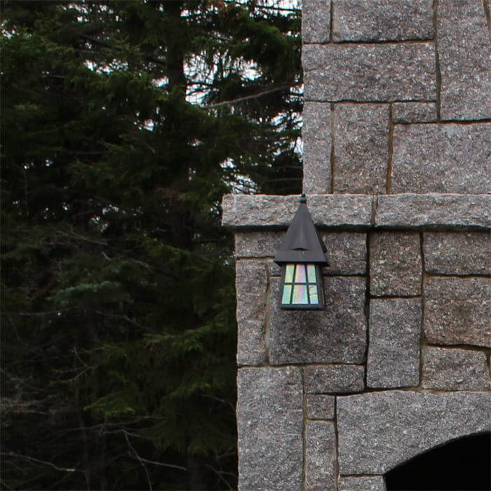 Over the years, customers have described our popular European Country Lantern as charming, romantic, and alluring. Inspired by the English Arts & Crafts movement that began in 1880 and flourished through the 1920‘s, this enchanting handcrafted outdoor lantern has an air of medieval charisma making it the ideal outdoor light for country homes, summer getaways, and fine estates in Tudor Revival and Arts & Crafts Style. This light fixture is a beautiful addition to courtyards, verandas, outdoor rooms, and porches, as well as fantastic on whimsical gazebos, summer houses, play houses, garden follies, boathouses, and seaside cottages. Shown above is a medium large version of this high quality made in Milwaukee outdoor lantern: European Country Lantern 10 inch Wide Curved Arm Exterior Wall Light with warm Antique Copper metal finish and Gold White Iridescent art glass panels. The European Country Lantern may look as if it‘s from a fairytale, but it is soundly built by skilled craftsmen and will last generations.