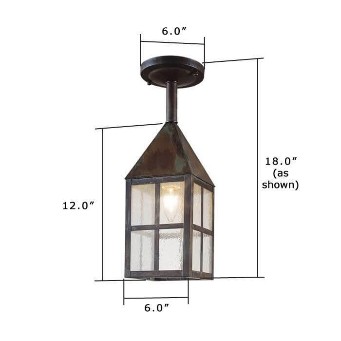 Simple, straightforward, and versatile, our popular Carriage Lantern 6 inch Wide Solid Stem Exterior Pendant Light is a fine outdoor lighting choice for small to medium sized front porches, side entries, pergolas, verandas, and covered balconies and terraces. Over the years, our customers have ordered the made in Milwaukee lantern for many styles of American Vernacular architecture including Tudor Revival, New England Saltbox, Midwest Farmhouse, Shaker inspired homes, lake cottages, and rustic northwoods cabins. Tailor the handcrafted Carriage Lantern to your style of architecture by choosing from three distinct decorative Overlays, 6 high quality metal finish options, and 9 creative art glass panel choices. Order the stem mounted lantern in the ideal Overall Length for your ceiling height. If you need assistance determining the best choice for your outside ceiling light, please contact our sales team for expert lighting advice.