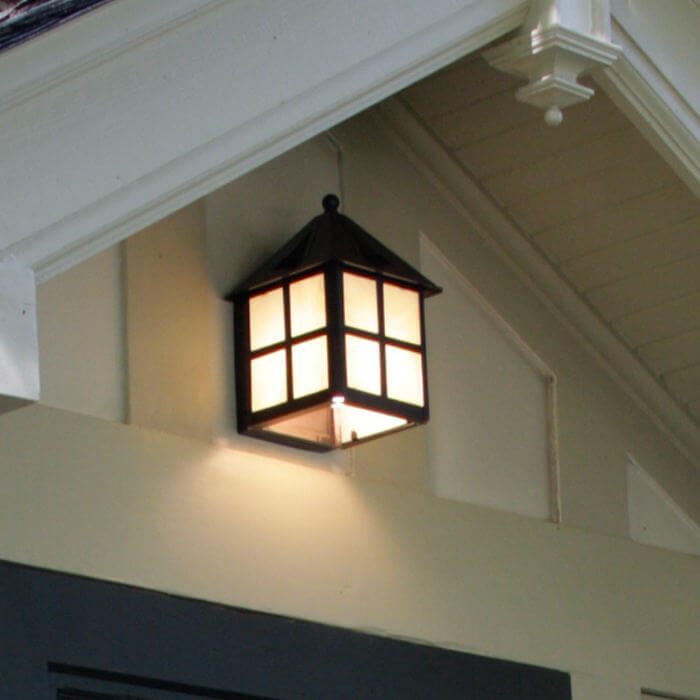 This Cottage™ Lantern 6″ Wide Flush Exterior Wall Light illuminates the front entry of this beautifully restored Provincial Revivalist home. The Provincial Revivalist design style is a charming genre from the Storybook period of circa 1920’s American architecture, also known at Fairy Tale or Hansel & Gretl houses. The flush exterior wall light is perfect for exterior lighting use where minimal projection is desired, such as over front doors and at side entryways. The classic design of this made to order outdoor light works perfectly with a variety of period home styles. Shown in Architectural Bronze finish with Cream glass and Windowpane overlay, this style of lantern fits in with the Fairy Tale style of 1920’s homes and cottages.