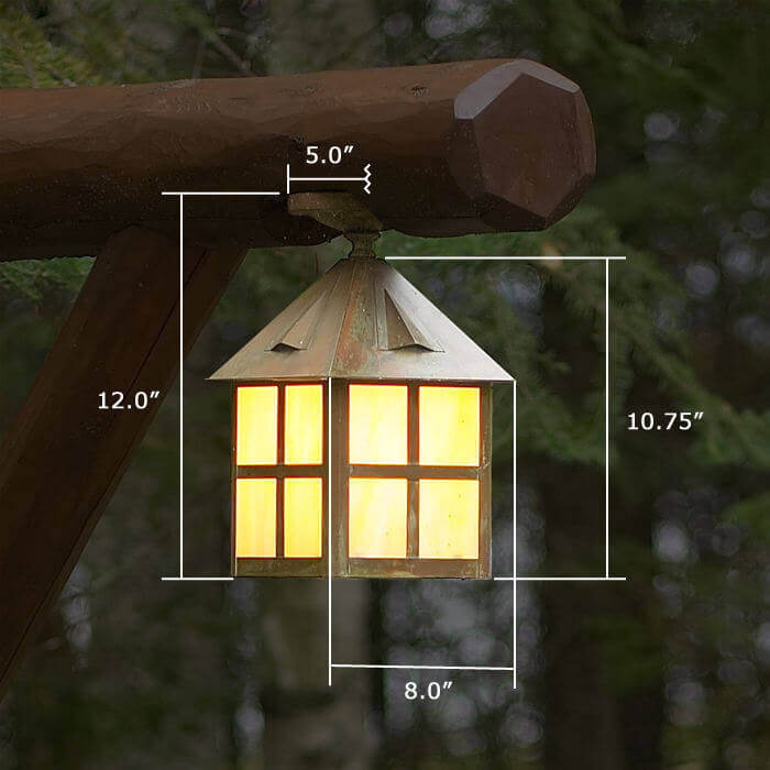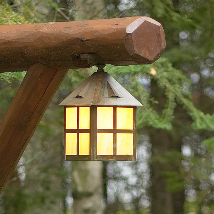 The owners of the north woods getaway pictured constructed a rustic but distinguished driveway marker for the entrance to their remotely located property. By incorporating peeled log posts with indigenous rock, a perfect location for an outdoor lantern was created. Our eight inch wide semi-flush exterior Cottage Lantern with ceiling mount provides warm light for this memorable marker in the woods. The popular combination of natural Verdigris Patina finish with warm Gold White Iridescent glass art panels topped by the classic Windowpane overlay looks perfect in the forest. Our ever popular Cottage Lantern has its design origins in the 1880‘s Shingle Style houses built along the New England coast. It is also fitting for Rustic Cabins, Cottage Style, American Foursquare, Arts & Crafts, Craftsman and many other traditional architectural styles of American homes.
