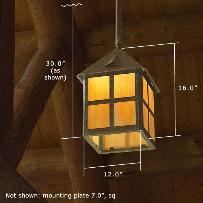 A Cottage™ Lantern 12″ Wide Solid Stem Exterior Pendant Light illuminates a post and beamed cathedral ceiling of an elegantly rustic Northwoods lodge. This large, handcrafted lantern is ideal for lighting bucolic interior and exterior spaces with ceiling heights of 8′ 6″ or higher. Shown in Verdigris Patina finish with Gold White glass and Windowpane overlay, this superb lantern provides an eye-catching focal point in a large open space.