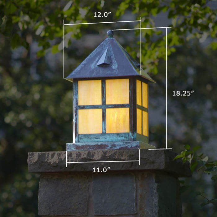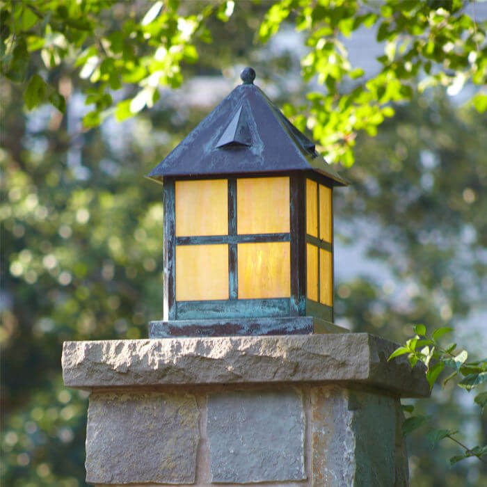 Nothing says “Welcome“ to a guest or resident as cheerfully as an inviting exterior light. For the home with stone pillars at the driveway or front gate, larger scale lanterns present a warm statement, serve as a notable landmark, and provide beautiful light. Whether custom stone or brick, masonry entrance ways dress up curb appeal and outdoor lighting is the perfect finishing touch. Pictured is the Cottage™ Lantern 12″ Wide Exterior Pier Light in our classic Verdigris Patina with Gold White Glass Panels. The Overlay chosen for this driveway entry light is the charming Windowpane option, a detail which helps to connect the striking entrance columns with the custom double hung windows on the home. Carefully made with the most durable materials in our Milwaukee, Wisconsin production facility, every Cottage Lantern is hand crafted by expert artisans and designed to withstand harsh elements and retain its unique character for years to come.