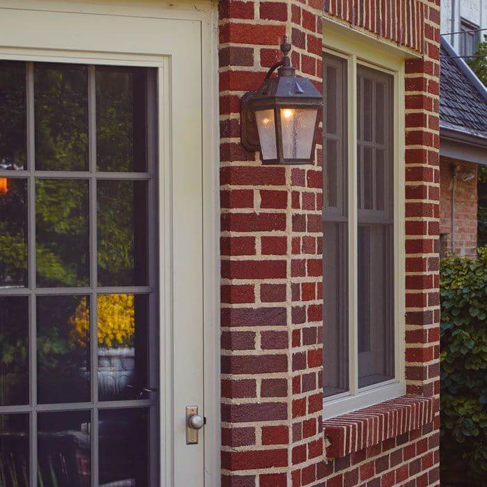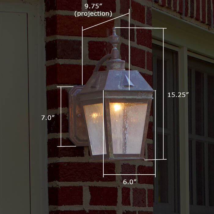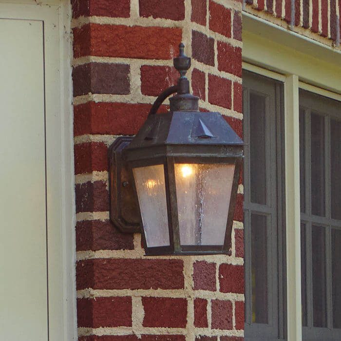 The Georgian Lantern is one of Brass Light Gallery‘s most formal exterior lanterns, offering period design and traditional elegance. This handsome outdoor light is crowned with a turned urn finial, durable roof overhang, and graceful articulated roof vents. Shown above is our smaller scale Georgian Lantern 6 inch Wide Curved Arm Exterior Wall Light in rich Architectural Bronze finish with traditional Clear Seeded art glass panels. This smaller size, classic style outdoor light works well for smaller front porches, side entrances, one car garages, airing porches, covered balconies, and petite patios. Over the years, our customers have ordered the Georgian Lantern for homes and buildings in the style of Georgian Revival, Federal, French Colonial, Early Classical Revival, and other traditional American styles of architecture. If you need help determining the best scaled Georgian Lantern for your outdoor lighting, please contact our sales team for help.