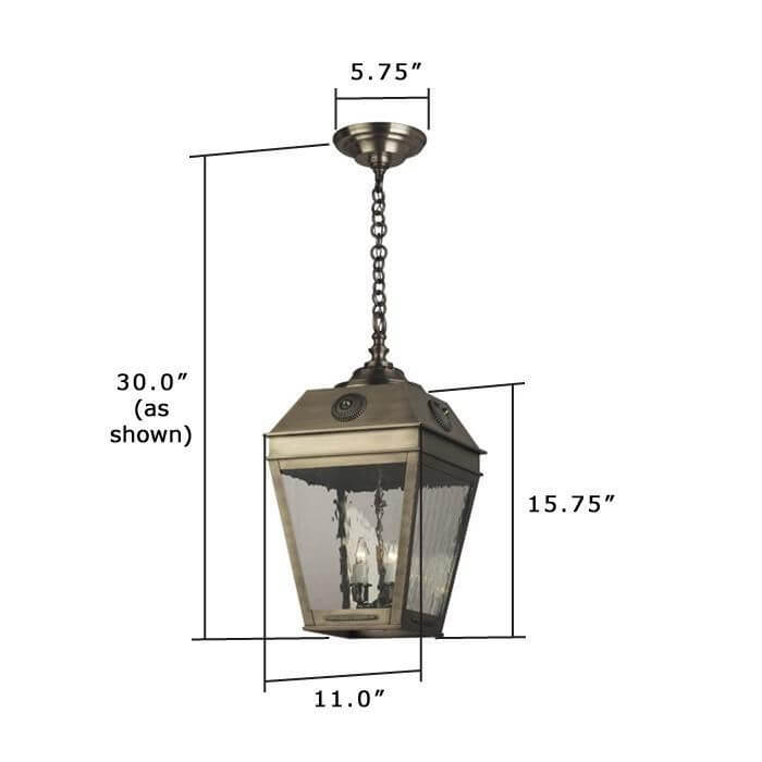 The French Country Lantern style is a popular architectural motif because of its casual elegance, grace and warmth. Our exceptional handcrafted outdoor lantern includes many European influenced design elements including sunburst rosettes along the roof line, smaller wheat motif castings, and a solid cast mounting plate. Shown above is our French Country Lantern 11 inch Wide Chain Hung Exterior Pendant Light in classic Satin Antique Brass metal finish with traditional Waterfall art glass panels. This high quality large scale pendant lantern makes a striking statement at front entrances with tall porch ceilings. Over the years, homeowners have also ordered this exceptional lantern light fixture for indoor locations such grand foyers, tall stairwells, and great rooms with high ceilings. Owners of traditional and historic homes in the styles of Queen Anne, Regency, and Georgian as well as rustic French Country cottages and country homes appreciate this superior family of lanterns for its ability to be the perfect architectural element, complementing the important details inherent in period homes. All of our lighting is soundly built in Milwaukee by skilled craftsmen and craftswomen and will endure for generations indoors or out.