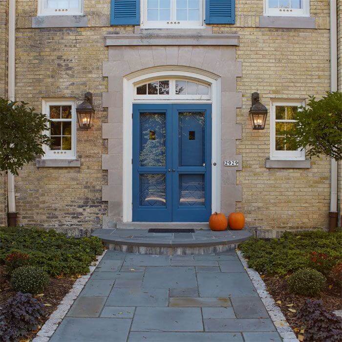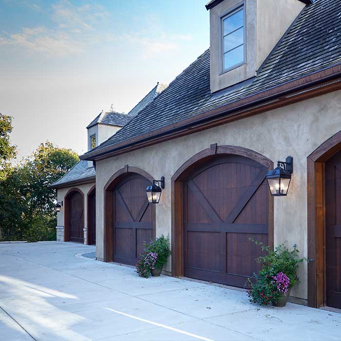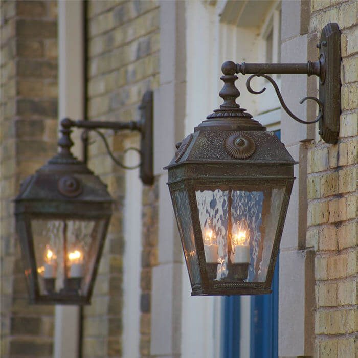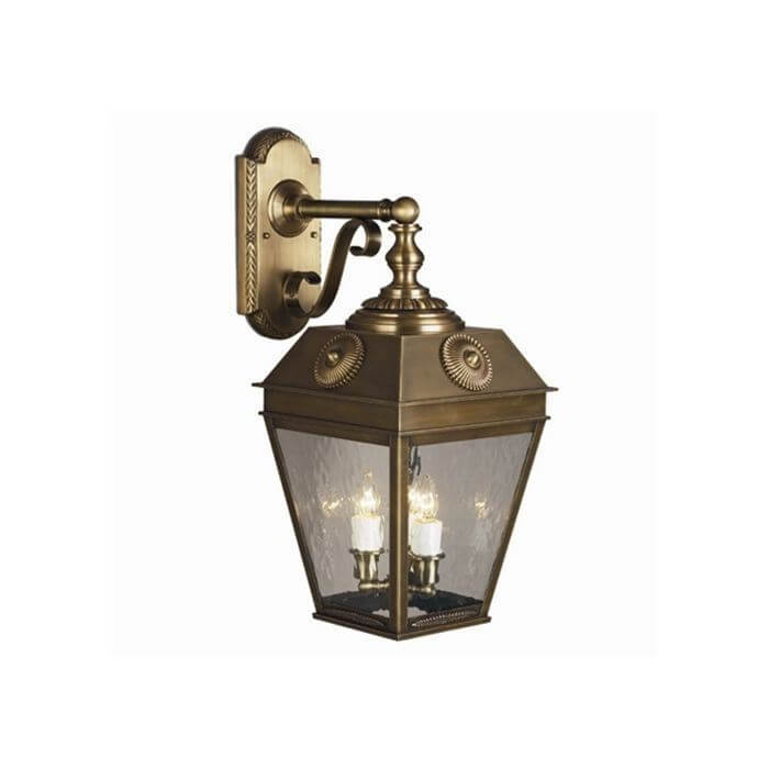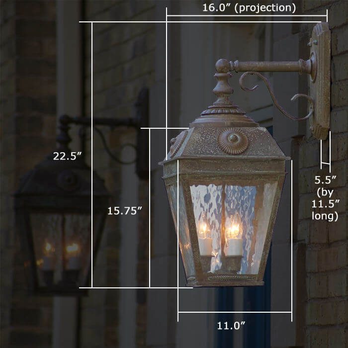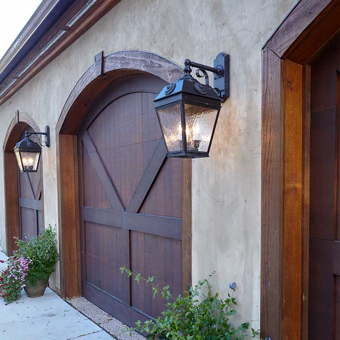 The French Country Lantern style is a popular architectural motif for its casual elegance, grace and warmth. The handcrafted outdoor lantern includes many European influenced design elements such as sunburst rosettes along the roof line, smaller wheat motif castings, and a robust acorn finial. Shown above is the larger scale French Country Lantern 11 inch Wide Scrolled Drop Exterior Wall Light. This high quality traditional outdoor light makes a striking statement over doorways, on brick or stone walls, and mounted on columns at driveway entrances. Owners of traditional and historic homes in the styles of Queen Anne, Regency, and Georgian as well as New Traditional and Country Homes appreciate this superior family of Lanterns for its ability to be the perfect architectural element, complementing the important details inherent in period homes. The French Country Lantern shown above is in the elegant combination of warm Satin Antique Brass metal finish with classic Waterfall art glass panels.