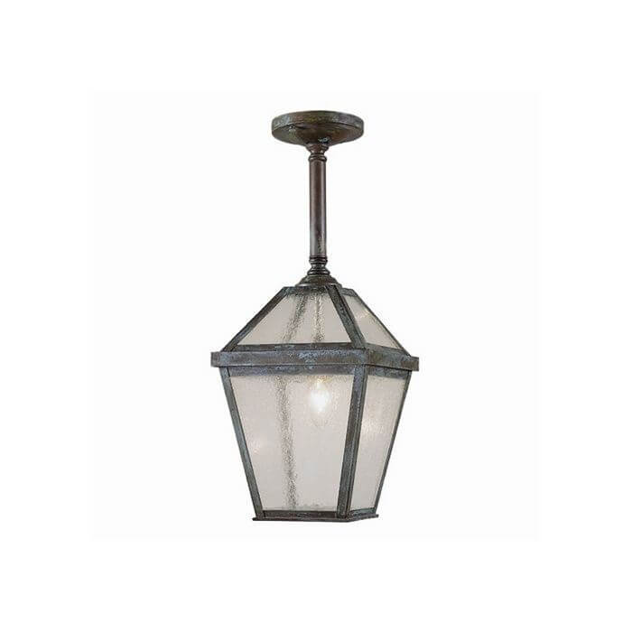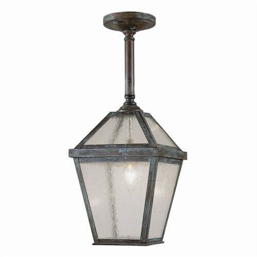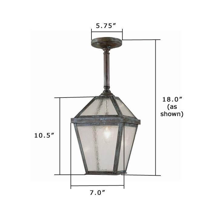 Shown above is our classically elegant London Lantern 7 inch Wide Solid Stem Exterior Pendant Light in authentic Verdigris Patina metal finish with traditional Clear Seeded art glass panels. The handcrafted made in Milwaukee ceiling lantern is an outstanding lighting choice for porches, verandas, covered balconies, at front entrances, on elegant garages, and for historic coach houses, boat houses, gazebos, carriage barns, and other outbuildings. Inspired by the glass enclosed conservatories of 19th Century British country estates, this traditional lantern works well with a wide variety of historic, formal architectural styles including Queen Anne Victorian, English Tudor, Antebellum Style, Greek Revival, Georgian Revival, and Italianate. The London Lantern shown above has an 18 inch Overall Length, but can be made in any Overall Length ““ based on your ceiling height. If you need help determining the best scale, length, mounting option, metal finish or art glass panel choice for your London Lantern Pendant, please contact our sales team for helpful lighting design suggestions.