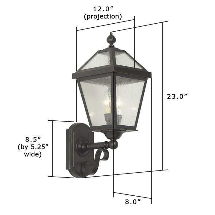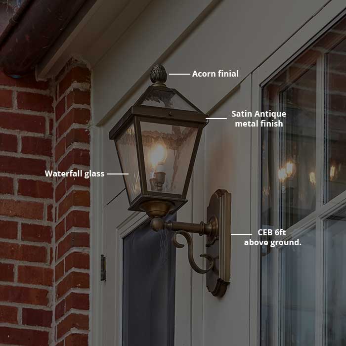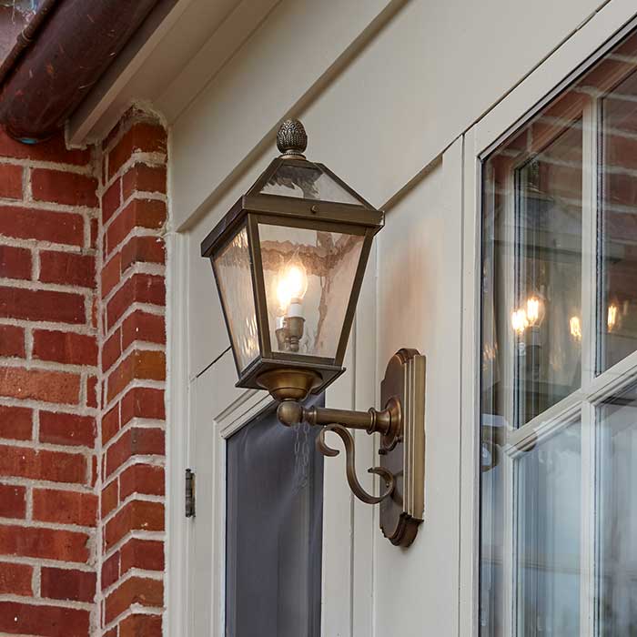 Shown above is our vertically oriented London Lantern 8 inch Wide Scrolled Coach Exterior Wall Light. The traditional style lantern is elegant and airy but substantially constructed and a favorite of architects and builders where stately form and significant lighting functionality is a must. Inspired by the glass enclosed conservatories of 19th Century British country estates, this traditional exterior lantern works well with a wide variety of historic, formal architectural styles including Queen Anne Victorian, English Tudor, Antebellum Style, Greek Revival, Georgian Revival, and Italianate. The handcrafted made in Milwaukee wall lantern is a superb choice on porch walls, at front entrances, along garden walls, on elegant garages, and for historic coach houses, boat houses, gazebos, carriage barns, and other outbuildings. Crucial details include a forged solid brass support on the scrolled arm, a solid brass cast mounting plate, and your choice between our standard Onion Finial or massive Classical Acorn Finial to perfectly top off this outstanding lantern. If you need help determining the best scale, mounting option, metal finish or art glass panel choice, or finial option, please contact our sales team for helpful lighting design suggestions.