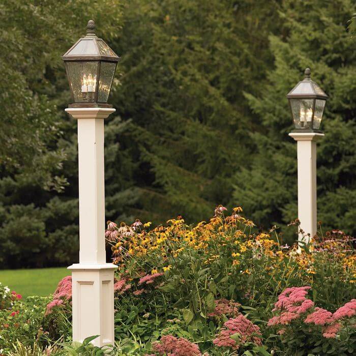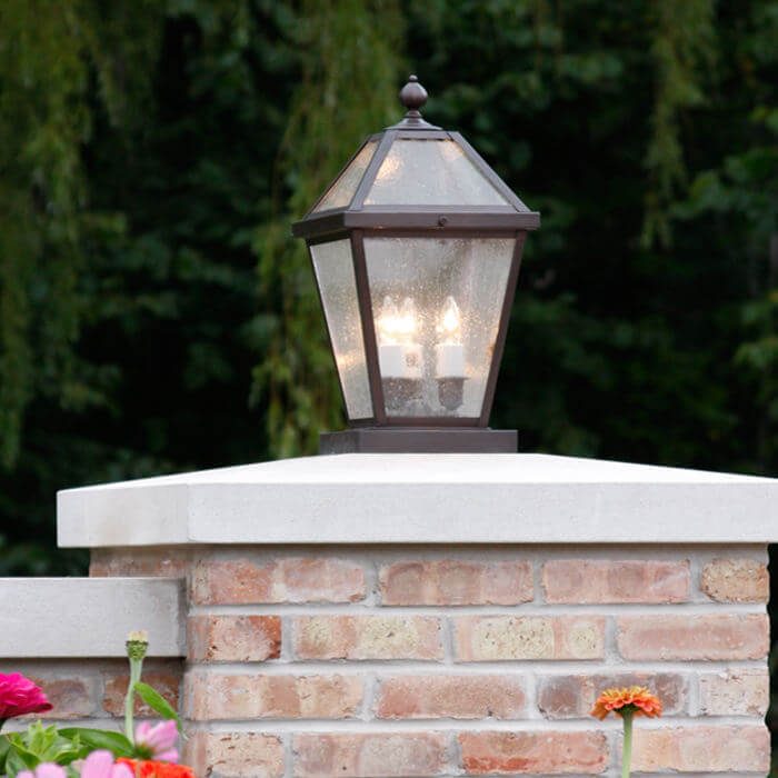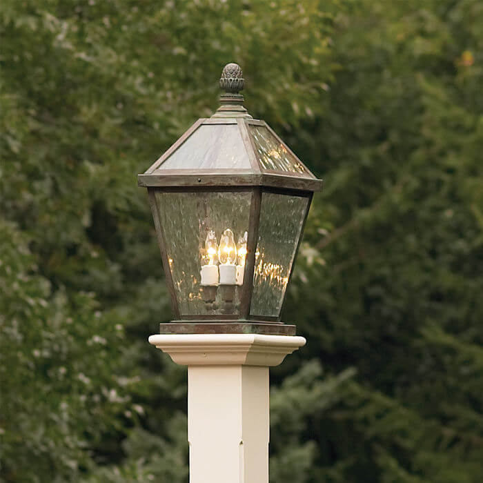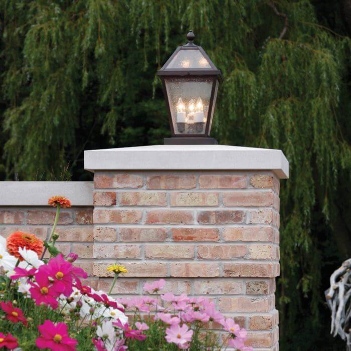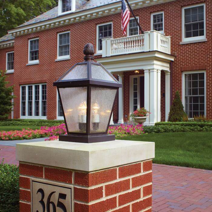The Washington Highlands is one of Milwaukee’s best preserved historical neighborhoods. Most of the 1900 to 1920’s homes are listed on the National Historic Register of Places and the residents asked for an architecturally appropriate column mounted lantern for the entryways to this locale. Topping the custom mounted cut stone piers are our elegant French Country Lanterns in Architectural Bronze with Clear Seeded glass panels. These exceptional exterior light fixtures feature a decorative multi-socket cluster, a prominent acorn finial, and sunburst rosettes along the roofline.