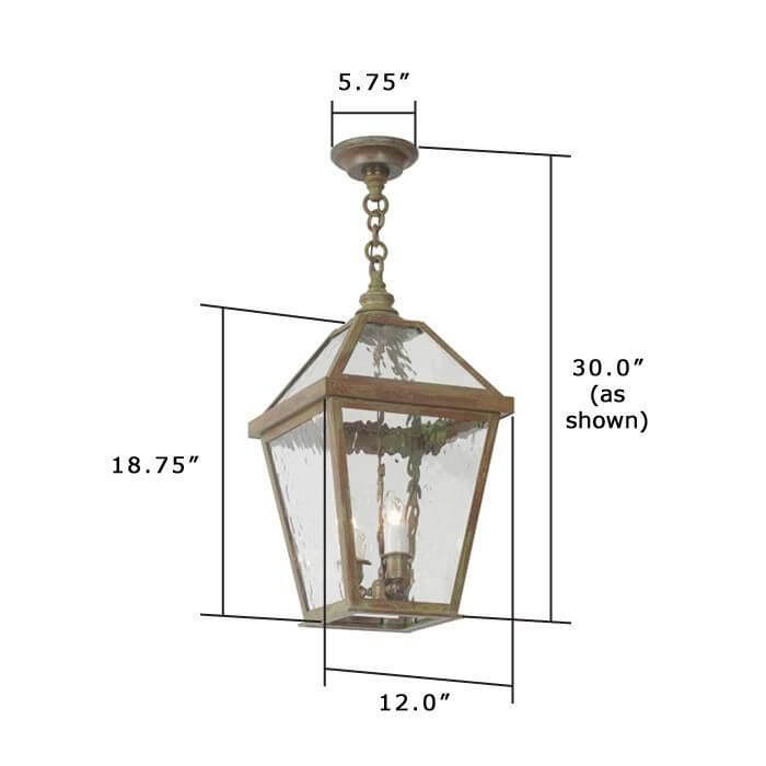 Shown above is our classically elegant London Lantern 12 inch Wide Chain Hung Exterior Pendant Light in authentic Verdigris Patina metal finish with traditional Waterfall art glass panels. The large scale lantern pendant is a fine choice for large interiors with tall ceilings such as grand entrances, large foyers, tall stairwells, and two-story great rooms. The handcrafted made in Milwaukee ceiling lantern is also a superb choice on porches, verandas, at front entrances, on elegant garages, and for historic coach houses, boat houses, gazebos, carriage barns, and other larger scale outbuildings. Inspired by the glass enclosed conservatories of 19th Century British country estates, this traditional lantern works well with a wide variety of historic, formal architectural styles including Queen Anne Victorian, English Tudor, Antebellum Style, Greek Revival, Georgian Revival, and Italianate. If you need help determining the best scale, mounting option, metal finish or art glass panel choice for your London Lantern Pendant, please contact our sales team for helpful lighting design suggestions.