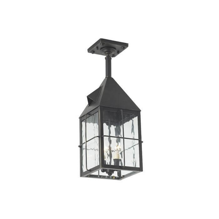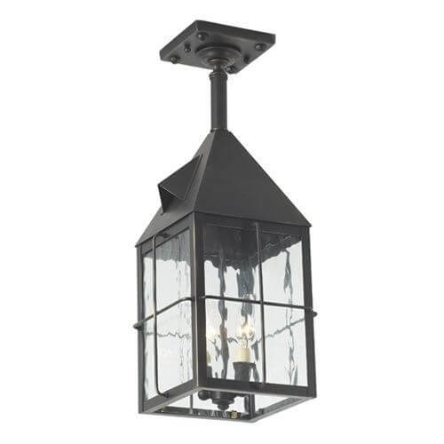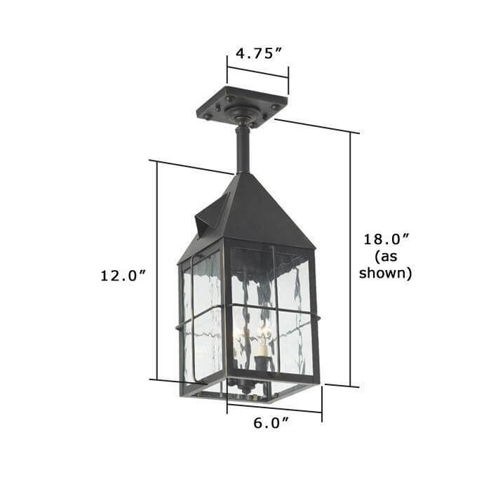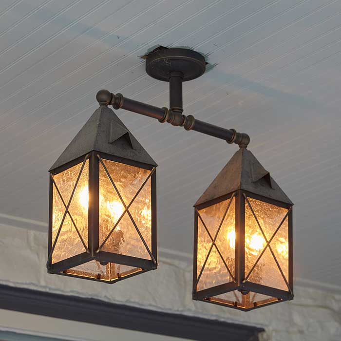 Shown above is our handcrafted Lancaster Lantern 6″ Wide Solid Stem Exterior Pendant Light. Shown in rich Architectural Bronze metal finish with traditional Clear Seed art glass panels and Windowpane Overlay, the handcrafted outdoor light provides direct illumination and period architectural interest. The Lancaster Lantern is a rustically elegant exterior light fixture with a steeply pitched roof, raised bar overlay over art glass panels, and a multi-socket cluster to ensure reliable outdoor lighting that captivates with historic design details. The exterior ceiling mounted pendant lantern has a solid cast mounting plate with hand formed rivets and a decorative circular medallion and stem break. This smaller scale made in Milwaukee outdoor light is a great choice for front and side porches, verandas, and covered balconies, gazebos, garden follies, and historic coach houses. For help in determining the best Overall Length of our made-to-order lantern for your unique location, please contact our sale team for assistance.