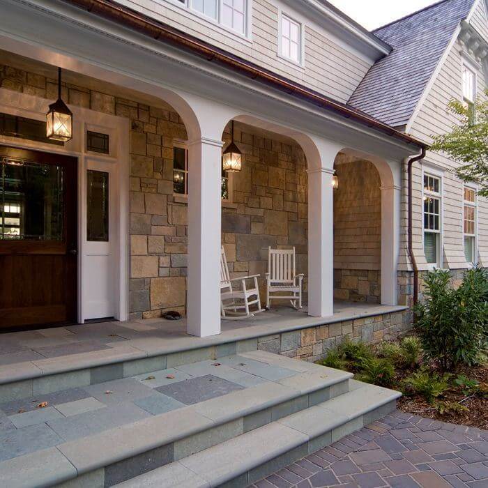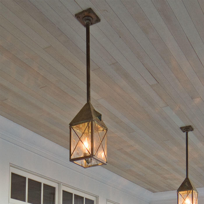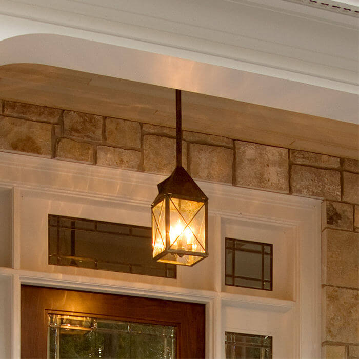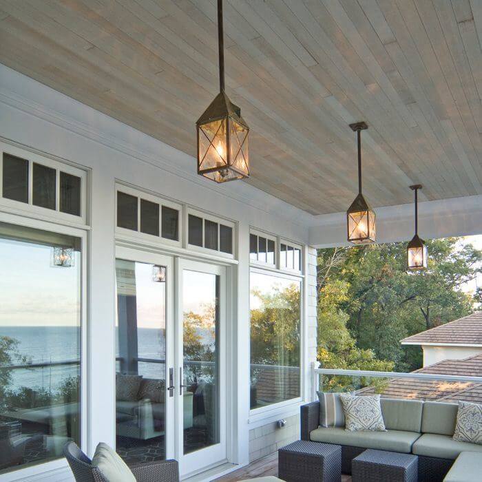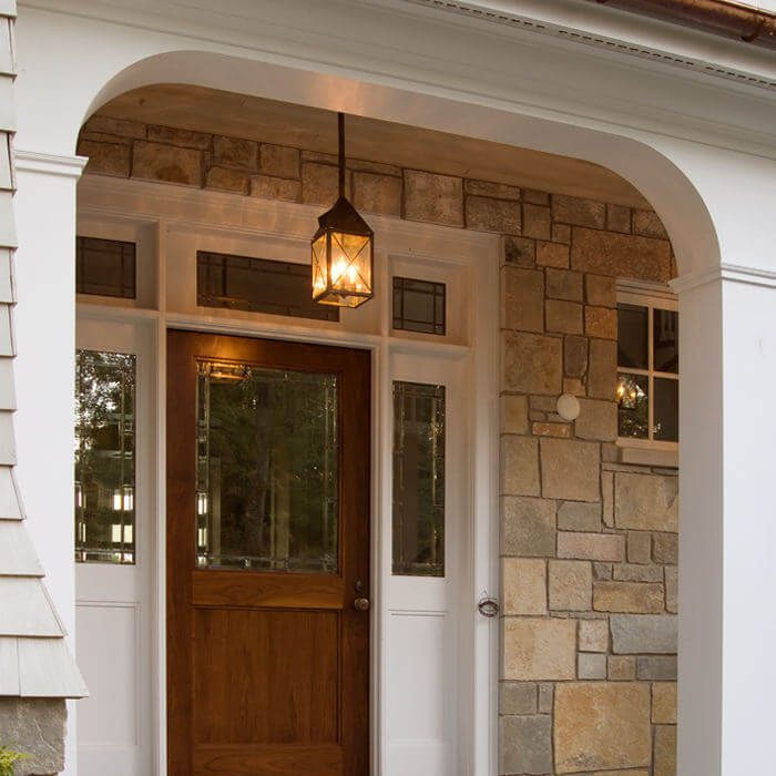 This newly constructed Shingle Style home has the feel of the Hamptons but is located on the Eastern shore of Lake Michigan. Collaborating with interior designer Lauryn Pappas, architect Scott Renken created a low key, inviting, smart looking exterior incorporating traditional materials such as stone and cedar shake with historic architectural details such as double hung windows and outdoor porches with beadboard ceilings. Repeating elements throughout the sprawling home create a cohesive design. One of the elements used at each entrance and on every porch is our Lancaster™ Lantern 7″ Wide Solid Stem Exterior Pendant Light. Our high quality handcrafted outdoor light provides warm illumination and attractive architectural detail for the several porches and outdoor entertaining areas of this noteworthy home.