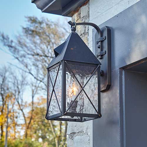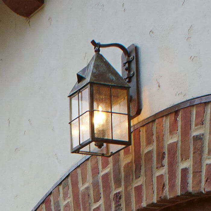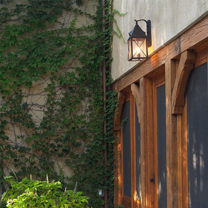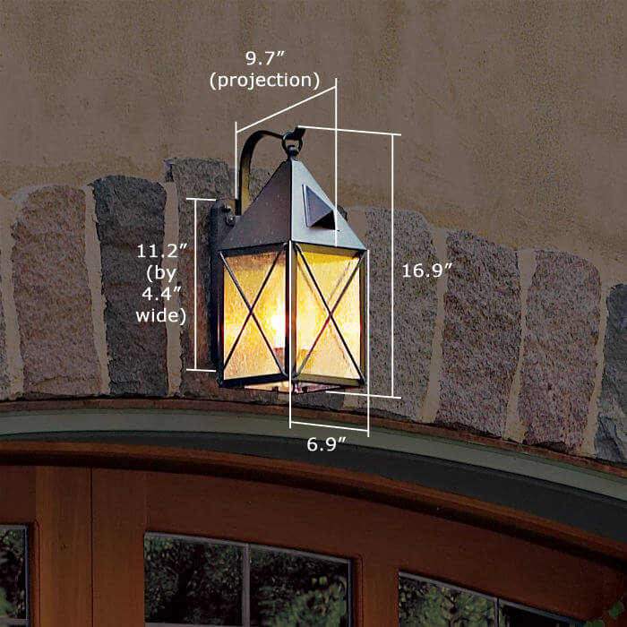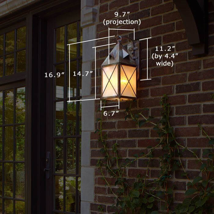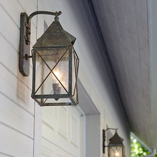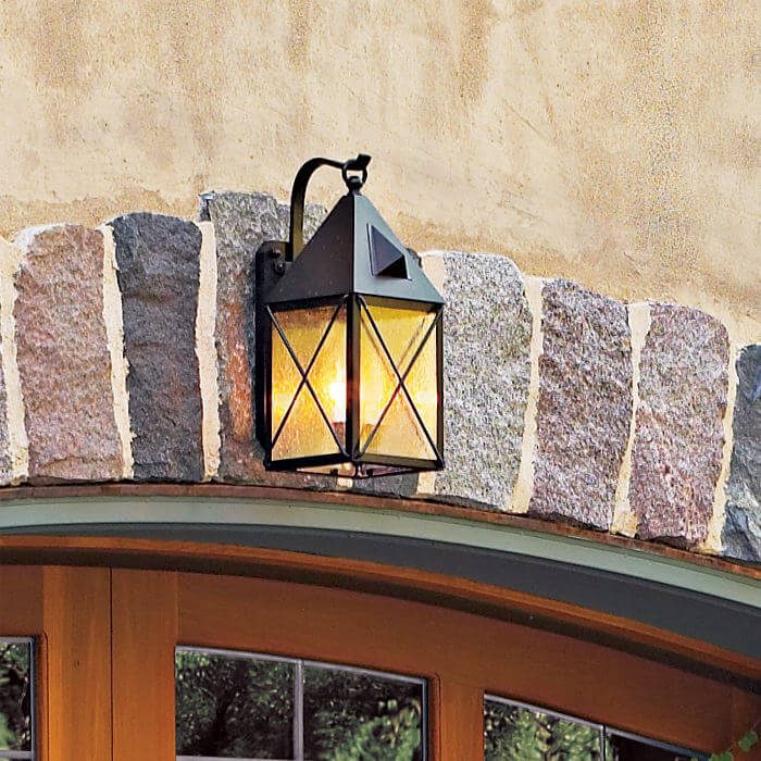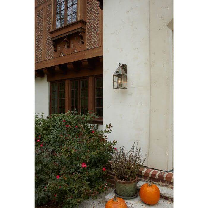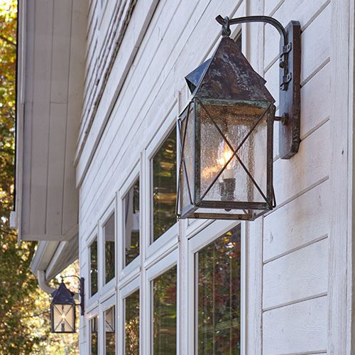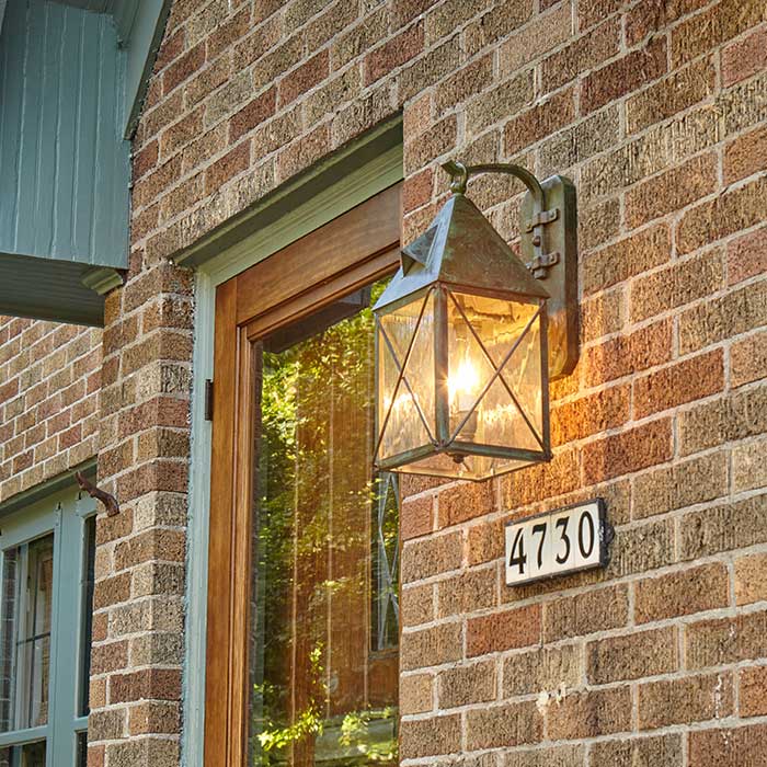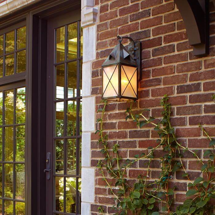 Lancaster™ Lantern 7″ Wide Scrolled Hook Exterior Wall Light The gracious porch on this Lake Michigan home is beautifully illuminated with several Tudor Revival inspired 6 inch Lancaster Lanterns with Scrolled Hook Wall Mount. The Tudor Revival emphasis on simple and rustic design was a reaction to the ornate Victorian Gothic revival of the late 19th Century and combines Elizabethan and Jacobean design details such as the steeply pitched roof and raised overlay. The architect for this unique home paid special attention to the outdoor lighting and chose our classic Verdigris Patina and Waterfall glass panels with the charming Crosscut Overlay. The Lancaster Lantern works well on the exterior of cottages, on the porches and garages of Arts & Crafts homes, and on Tudor Revival residences. It is entirely appropriate for any building with half-timbering, herringbone brickwork or mullioned and dormer windows. For mansions, country estates, or where a massive lantern is needed to make a strong statement, consider using the 12 inch wide x 26 inch tall version or call customer service to inquire about larger available sizes. Carefully made with the most durable materials in our Milwaukee, Wisconsin production facility, each Lancaster Lantern is handcrafted by expert artisans and designed to withstand harsh elements and retain its unique character for years to come.