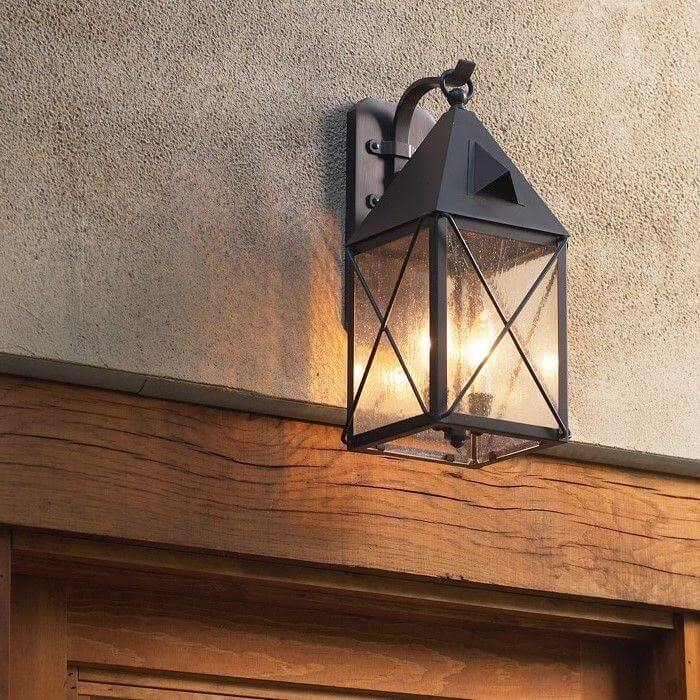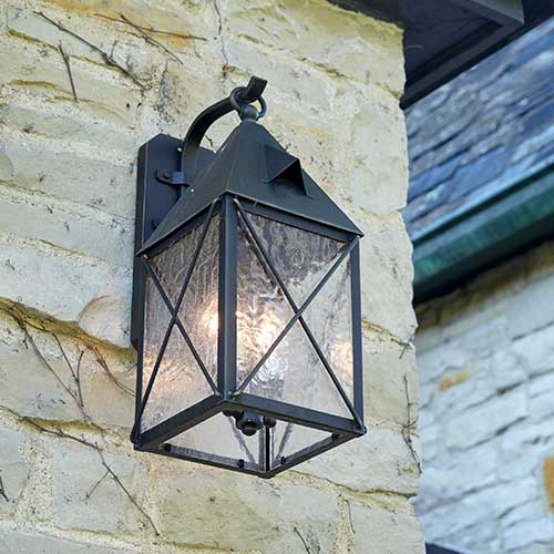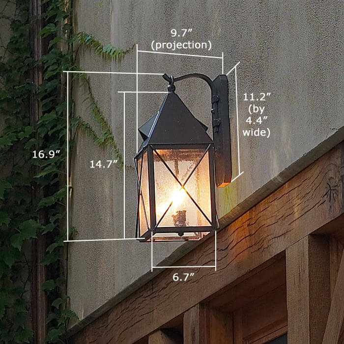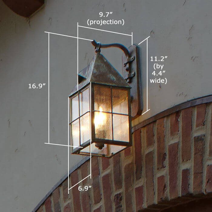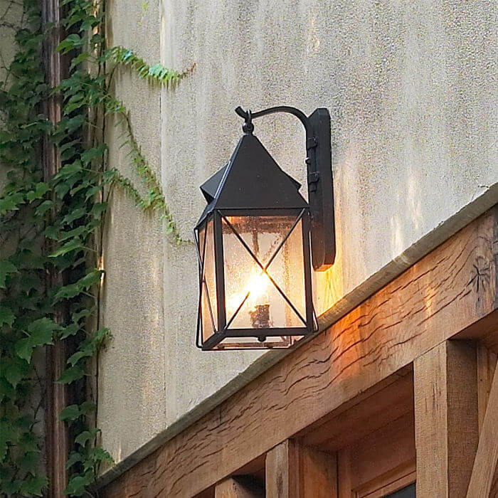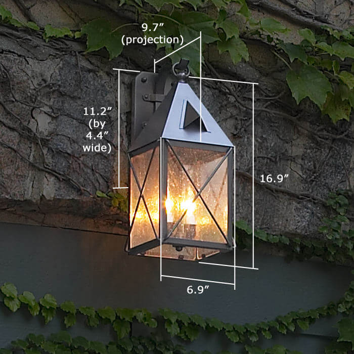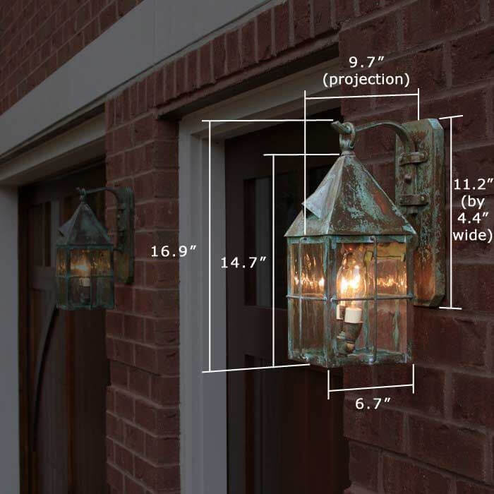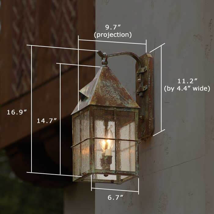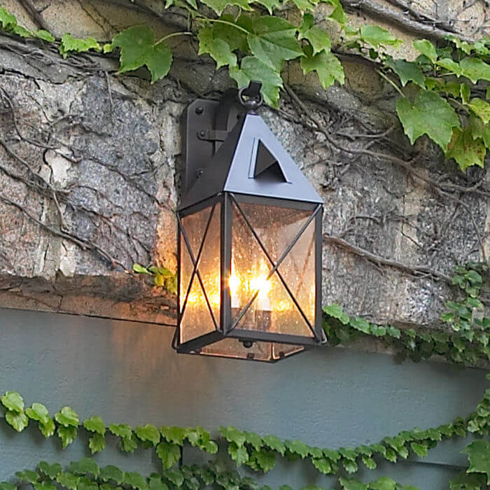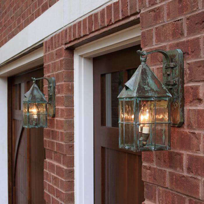 Lancaster™ Lantern 7″ Wide Scrolled Hook Exterior Wall Light The gracious porch on this Lake Michigan home is beautifully illuminated with several Tudor Revival inspired 6 inch Lancaster Lanterns with Scrolled Hook Wall Mount. The Tudor Revival emphasis on simple and rustic design was a reaction to the ornate Victorian Gothic revival of the late 19th Century and combines Elizabethan and Jacobean design details such as the steeply pitched roof and raised overlay. The architect for this unique home paid special attention to the outdoor lighting and chose our classic Verdigris Patina and Waterfall glass panels with the charming Crosscut Overlay. The Lancaster Lantern works well on the exterior of cottages, on the porches and garages of Arts & Crafts homes, and on Tudor Revival residences. It is entirely appropriate for any building with half-timbering, herringbone brickwork or mullioned and dormer windows. For mansions, country estates, or where a massive lantern is needed to make a strong statement, consider using the 12 inch wide x 26 inch tall version or call customer service to inquire about larger available sizes. Carefully made with the most durable materials in our Milwaukee, Wisconsin production facility, each Lancaster Lantern is handcrafted by expert artisans and designed to withstand harsh elements and retain its unique character for years to come.