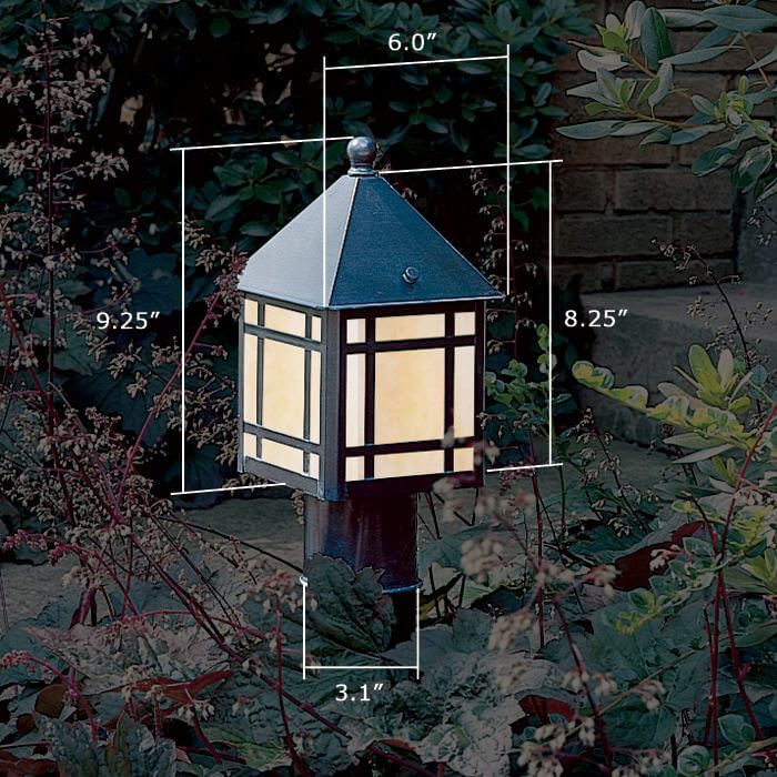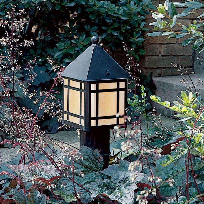 The home owner who designed the beautifully landscaped flagstone walkway pictured, chose a striking combination of our rich Architectural Bronze finish, warm Gold White Art Glass panels, and classic Foursquare Overlay. Beautiful in the summer with Palace Purple Heuchera and Purple Passion Rhododendrons, Bungalow Lantern path lighting also offers winter interest during the Midwest‘s snowy season. The wide range of lantern sizes and exterior mounting options Brass Light Gallery offers ensure stylish coordination between garden and home exteriors, whether they be brick, wood, stucco or stone. Brass posts have the same high quality exterior finish as the light fixtures and can be ordered in any length. Our popular outdoor Bungalow Lantern has its roots in American Craftsmen and Bungalow Style Architecture. Simple yet artistic, this versatile lantern makes a picturesque statement when used for post mounted path lighting and landscape and garden lighting.