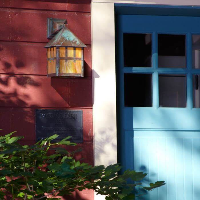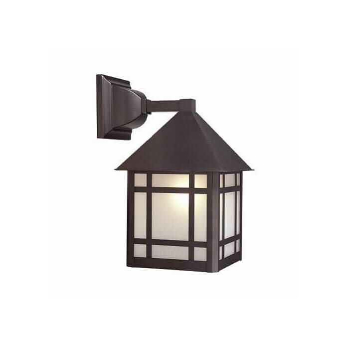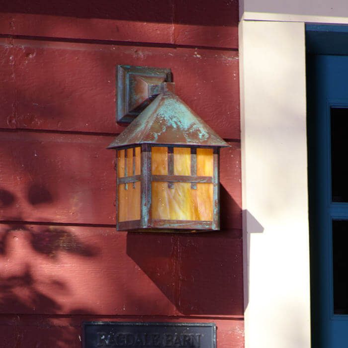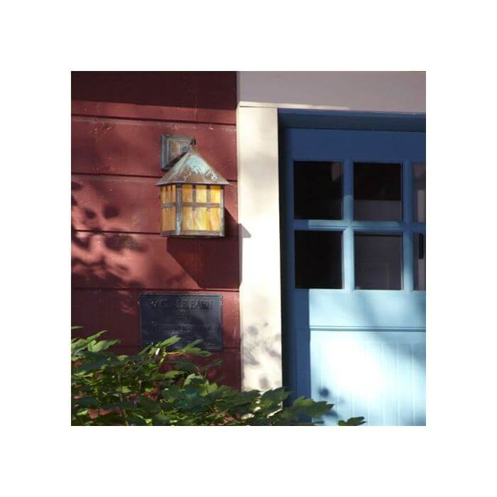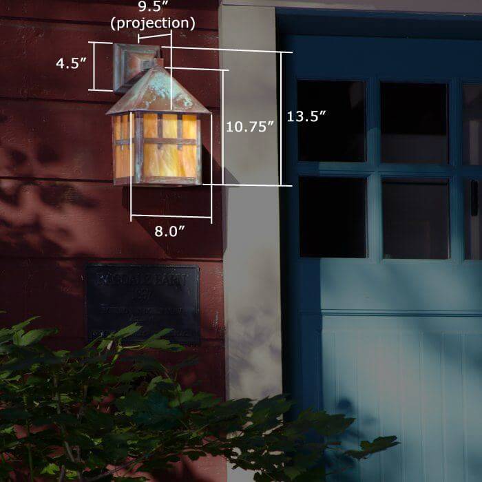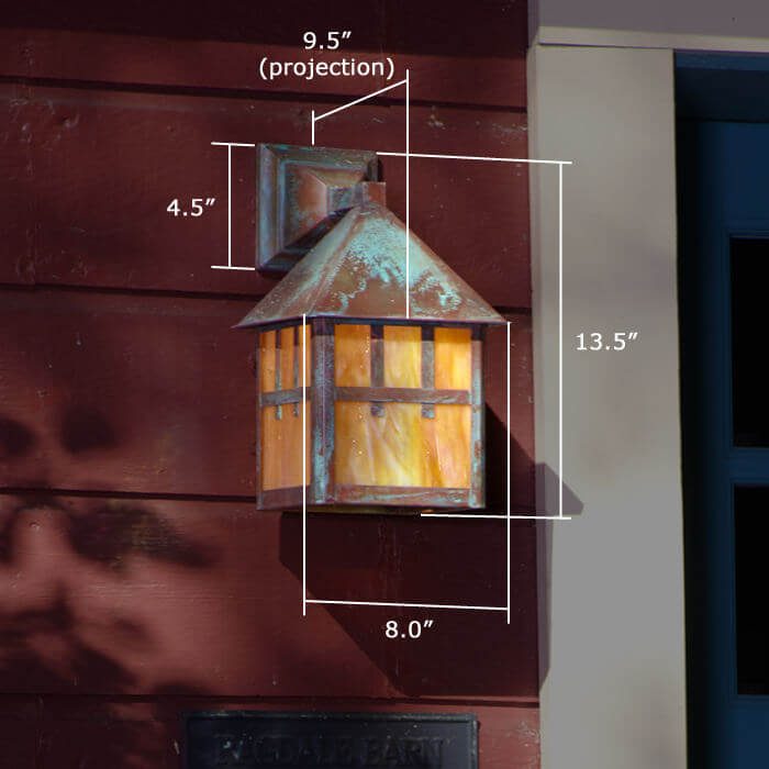 The Bungalow Lantern 8 inch Wide Straight Arm Exterior Wall Light meets the needs of homeowners across the country seeking an inspired exterior lighting choice for their Bungalow home. This American classic light fixture is famous for its affordability, durability and versatility of design elements. For a traditional Arts & Crafts exterior lighting look, use the Craftsman or Foursquare Overlay options. The made in Milwaukee outdoor lantern looks perfect on Bungalow, American Craftsman, and Shingle Style homes, seaside cottages, and rustic cabins. The smaller scale, wall mount Bungalow Lantern works well for lighting porches, side entrances, covered balconies, airing porches, and garages.