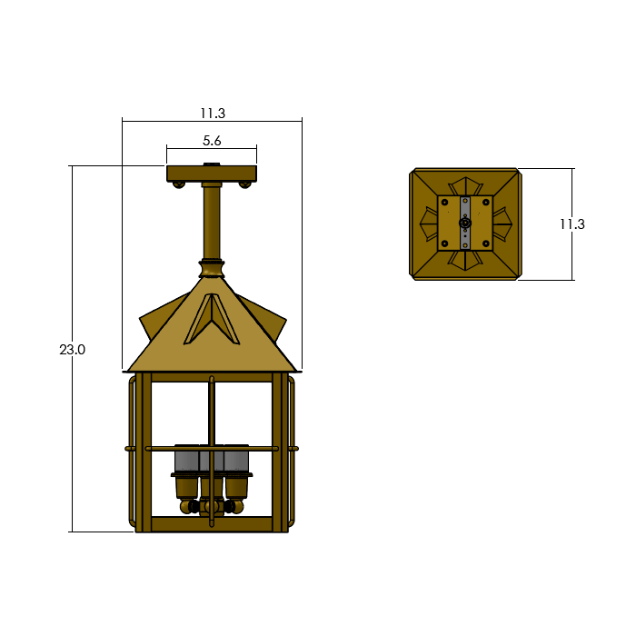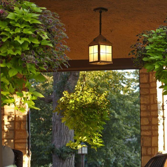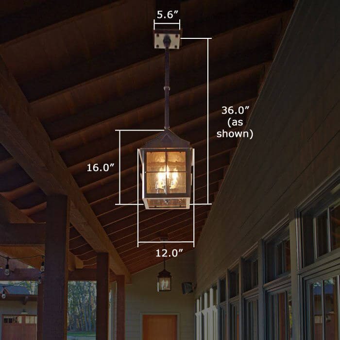 The recently constructed Modern Industrial Craftsman Cottage shown above was custom built with traditional materials such as cedar posts and beams, double hung windows with transom lights, wood siding painted in muted tones, and subtly colored natural cut stone. Lighting the wide covered walkway are handcrafted, high quality Stonehaven Lantern 12 inch Wide Solid Stem Exterior Pendant Lights. The exterior pendant lights add rustic charm and functional illumination, complementing the elegantly rustic exterior of the country home. The Overall Length of the medium/large scale lanterns was carefully chosen so the bottom edge of the lantern above the top of the transom lights. Our made in Milwaukee outdoor lights are sturdily built and feature robust details such as raised bar Overlay, articulated roof vents, cast stem details, and hand formed rivets on the heavy mounting plate. Inspired by Eastern Seaboard Stone and Shingle Style architecture, our Stonehaven Family of outdoor light fixtures is also at home on log cabins, mountain homes, Tudor Revival residences, and lakeside cottages. The outdoor pendant above is shown in rich Architectural Bronze finish with classic Waterfall art glass panels and Windowpane Overlay. Tailor our remarkable light fixture to suit your exterior with a choice of 6 high quality metal finishes, 9 art glass panel options, and two Overlays. Order the lantern in the best Overall Length for your ceiling height. If you need assistance determining the ideal length of your Stonehaven Pendant, please contact our sales team for helpful lighting design tips.