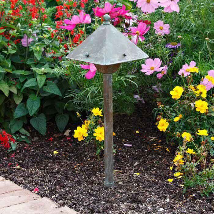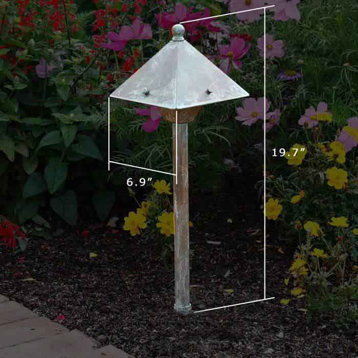 Our charming Market Path Light, made in the USA, is the perfect accent for landscaped yards, terraced gardens, and pathways and is also widely used to light front steps and the edges of outdoor rooms and patios. Like all Brass Light Gallery exterior light fixtures, it is ruggedly constructed of solid brass in our Milwaukee, Wisconsin plant and is available in your choice of metal finish. Patterned after European Market Umbrellas, it sports a 6 inch square tapered roof with a classic ball finial. This 12 Volt Market Path Light is a 19″ tall, versatile low voltage light, providing ample light to your walkway while fitting in with your current landscaping style. A line voltage version of this Market path light is also available.