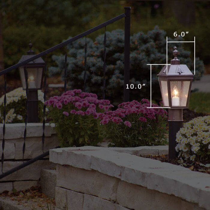 The homeowners of the landscaped yard pictured chose two Georgian™ Lantern 6″ Wide Exterior Post Lights to anchor cut stone flower beds and provide path lighting for the stairway. Shown in crisp Architectural Bronze finish with classic Clear Seeded Art Glass Panels, this exterior lantern makes a refined statement in the beautiful garden setting and coordinates with larger, wall mounted lanterns on the home.