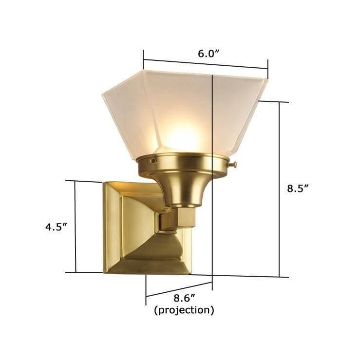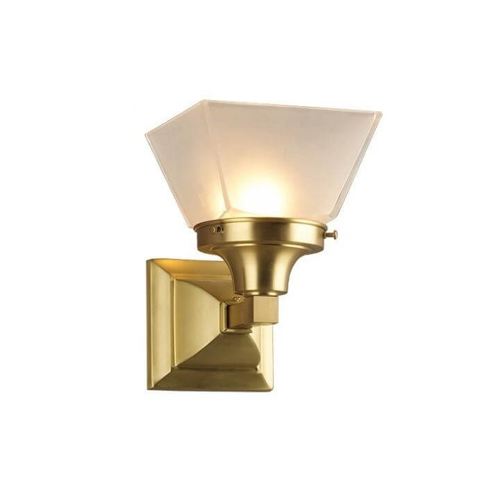The Glen Ellyn One Light Straight Arm Sconce with 4-1/4 inch shade holder offers robust construction and timeless design. The handcrafted wall mounted sconce has square components and a round glass shade holder which holds our larger scale C102 Sandblast Frost Square Glass Shade. Depending on your interior lighting needs, the versatile wall light can be mounted with glass facing up or glass facing down. This classic sconce is suitable for a variety of styles including Arts & Crafts, American Craftsman/Bungalow, Mission Style, Rustic, and Cottage Style. This sconce is a popular wall light for hallways, foyers, over fireplaces, and over bedside tables. Shown above in bright Brushed Brass finish with a clean Sandblast Frost Square Glass Shade, the Glen Ellyn One Light Straight Arm Sconce is available in 13 high quality metal finish choices. For assistance choosing the best metal finish and glass shade for your wall sconce, please contact our sales team for helpful lighting design ideas and tips.