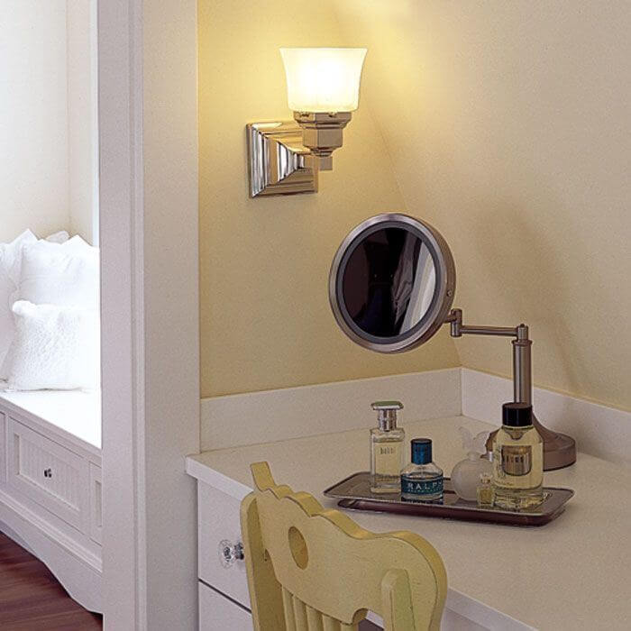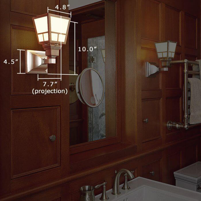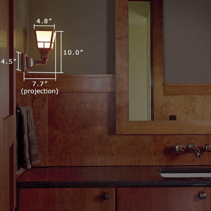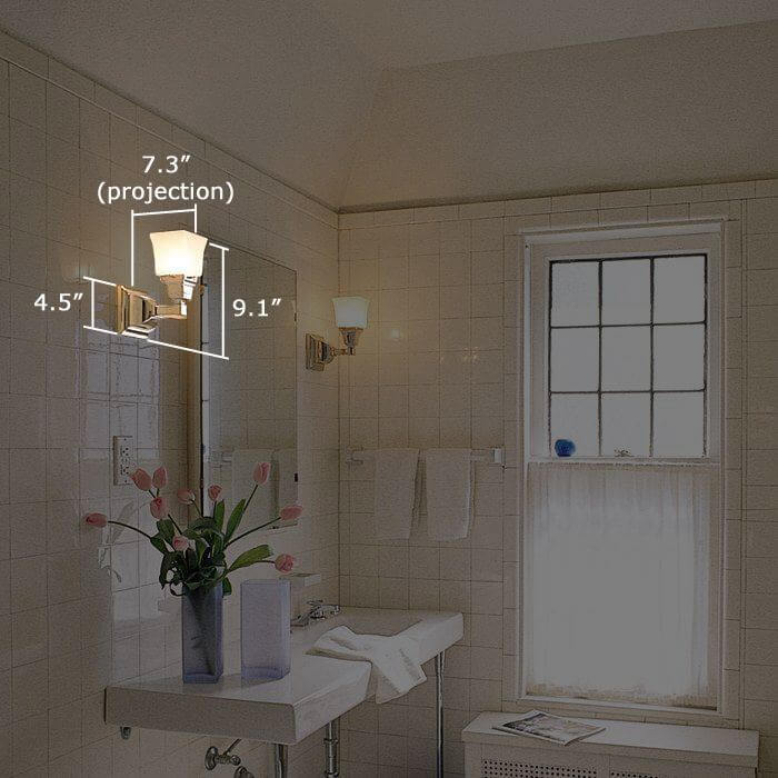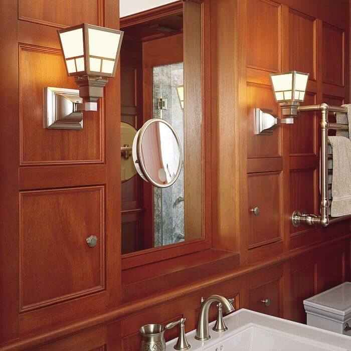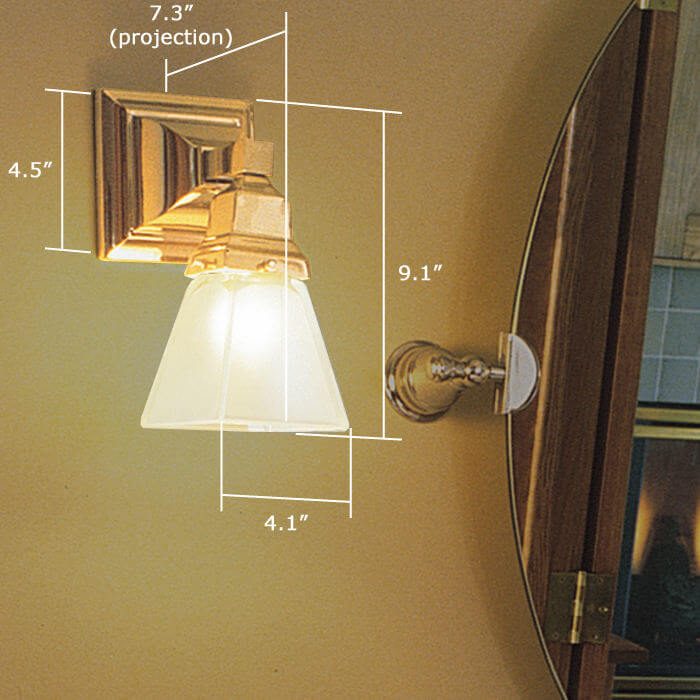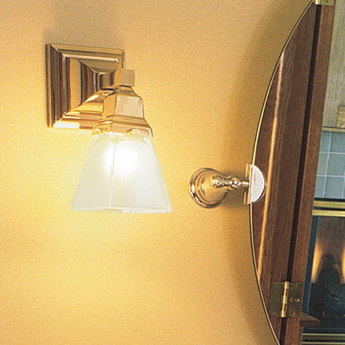 Our Oak Park One Light Straight Arm Sconce with 2-1/4″ shade holder is adaptable to many different environments including this clean and simple circa 1920’s white tiled bathroom. This interior lighting fixture offers timeless design, functional illumination, and solid construction.