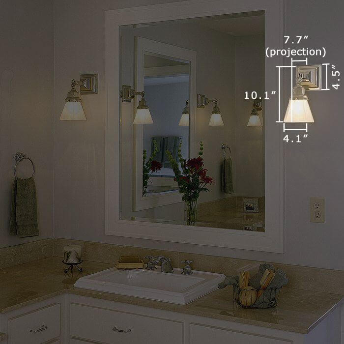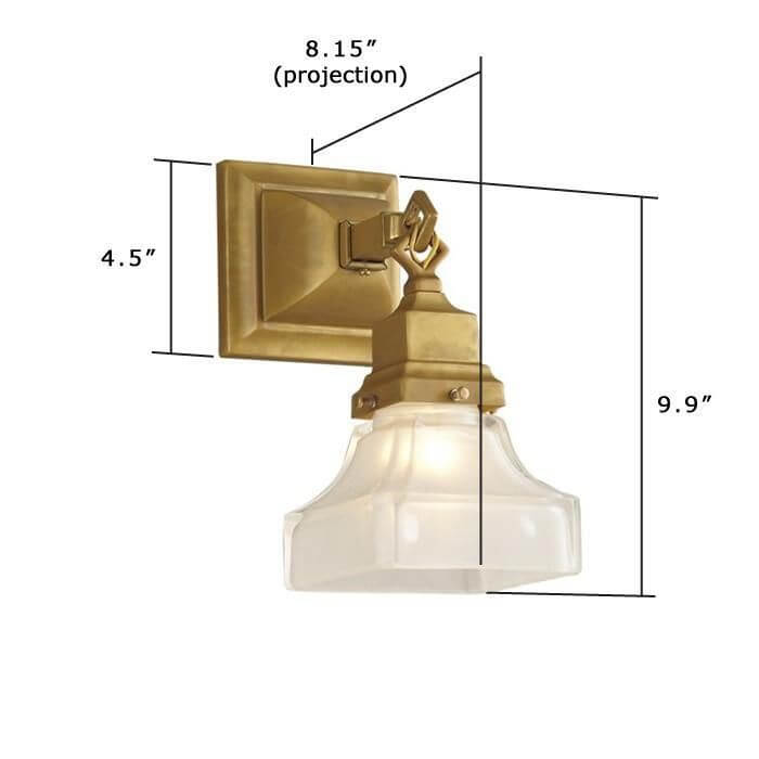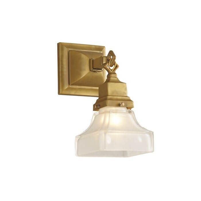 The Oak Park One Light Chain Link Sconce with 2-1/4″ shade holder offers timeless design and solid construction. A popular wall sconce for Arts & Crafts, Tudor Revival, American Craftsman, and Bungalow interiors, the Oak Park One Light Chain Link Sconce is a good choice for foyers, bathrooms, powder rooms, hallways, dens, studies, and home offices. Made in Milwaukee and shown in warm Distressed Brass metal finish with A105 Sandblast Frost Square Bell Glass Shades, the Oak Park One Light Chain Link Sconce can be tailored to suit your interior by choosing from our 13 high quality metal finishes and numerous glass shade options. For assistance choosing the best metal finish and glass shade for your wall light; please contact our sales team for helpful lighting design ideas and tips.