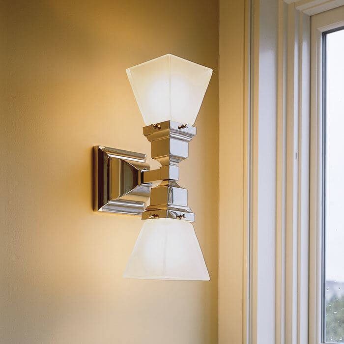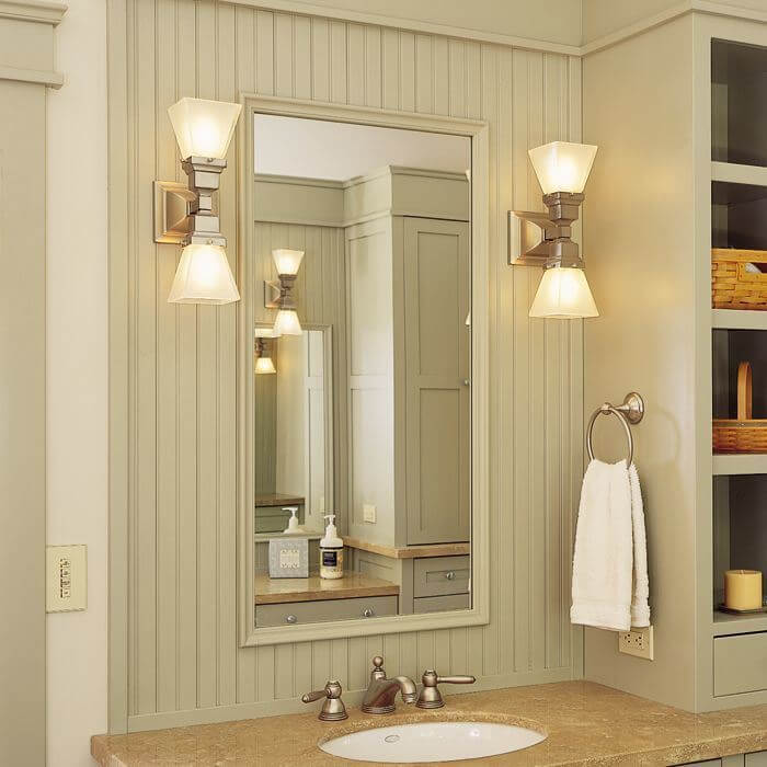 The crisp bathroom of a seaside cottage is abundantly lit by two linear two-light sconces. Mounted on a narrow area of painted beadboard on each side of the mirror, the sconces emphasize the vertical space and provide up and down lighting for this charming bath.
