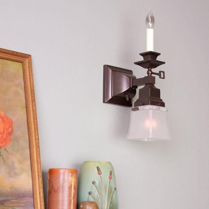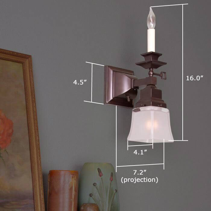Reproduced from antique American Gas/Electric lighting, circa 1890-1910, the made in Milwaukee Summit One Light Gas-Electric Sconce adds heirloom charm to interiors with vintage flair. The handcrafted classic wall light features a decorative gas key, replicating the valve originally used to regulate the gas flame – a striking and historic detail. The linear sconce provides upward illumination with the electric candle and direct down lighting through the glass shade. While this Gas-Electric Sconce is sure to be noticed and appreciated in any interior, it is especially fitting for Victorian, Arts & Crafts, Mission, and American Craftsman Bungalow Style décor.