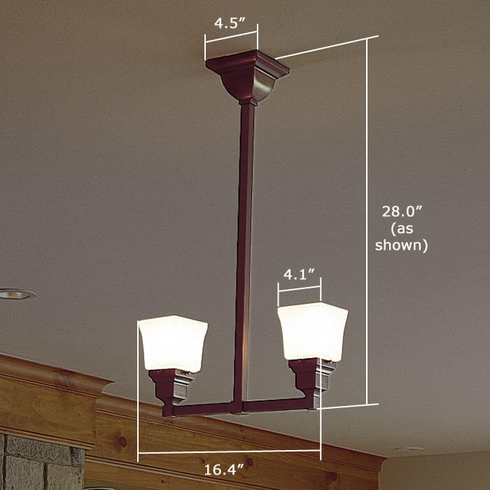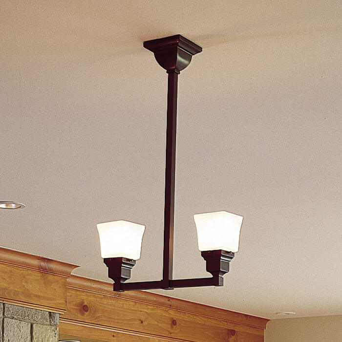 The sitting area of the inviting French Country Style living room pictured is lit by two of our made in Milwaukee Oak Park Two Light Pendants with 2-1/4 inch shade holders facing up. Shown in the background is a matching Wentworth Two Light Wall Sconce. The light fixtures are metal finished in our rich Architectural Bronze which complements the warm tones of the lightly stained wood beams, cabinetry, and granite countertop. The light fixtures are made of square components which go well with the elegantly rustic cut stone fireplace. The pendant fixtures shown have a 28 inch overall length which works perfectly with the ceiling height and lines up with the top of the wide painted wood molding around the French doors. Our handcrafted light fixtures are made in Milwaukee which means we make them exactly the way you order them.