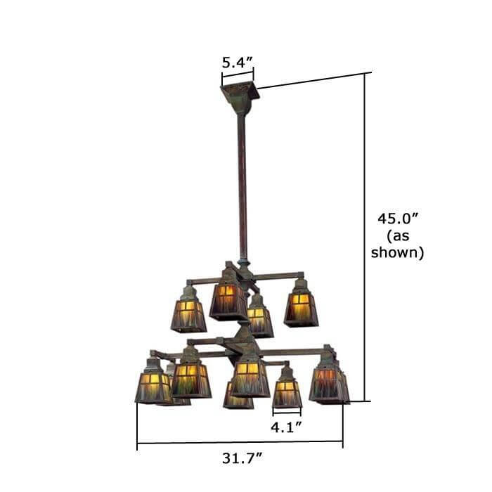 The Golden Gate Twelve Light Two Tier Chandelier with 2-1/4 inch shade holders facing down is a large scale chandelier suitable for big interior spaces such as grand foyers, two story entrances, great rooms, master suites, and wide stairwells. The handcrafted Golden Gate Twelve Light Two Tier Chandelier has robust scale with a large diamond center body that culminates in a square finial. Graceful lines and articulated edges convey a clean sense of classic American Mission Style, Craftsman Bungalow, and Arts & Crafts Style design. The Golden Gate Chandelier coordinates nicely with wall sconces in the Oak Park Family. Order the made in Milwaukee Golden Gate Twelve Light Chandelier in the best Overall Length for your ceiling height. Shown above authentic Verdigris Patina and A110 Windowpane Shades with Moss Art Glass Panels, the Golden Gate Chandelier is available in 13 high quality metal finish choices and with an array of Art Glass Panel choices and glass shades from our exclusive collection. For assistance choosing the best metal finish, glass, and Overall Length for your Golden Gate Chandelier; please contact our sales team for helpful lighting design tips.