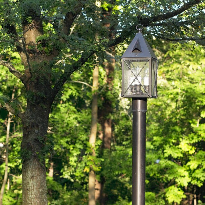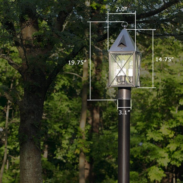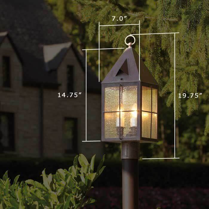 The grand 1920‘s stone Tudor home pictured has a large front yard with beautiful landscaping. Marking the driveway entrance is our Lancaster Lantern 7 inch Wide Exterior Post Light. The steeply pitched roof of the handcrafted lantern echoes that of the home‘s dormers. The outdoor light was metal finished in Antique Copper to match the original gutters and Clear Seeded art glass panels are in keeping with the period of this beautifully maintained Tudor Revival home. Handcrafted in Milwaukee of solid brass, our elegant post mounted outdoor lantern fits in perfectly with the exterior of the traditional period home.